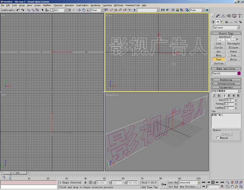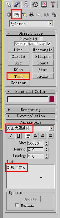 启动3dmax,在创建面板的spline下面,按下text,设好字体,在文本输入框输入“影视广告人”几个字。