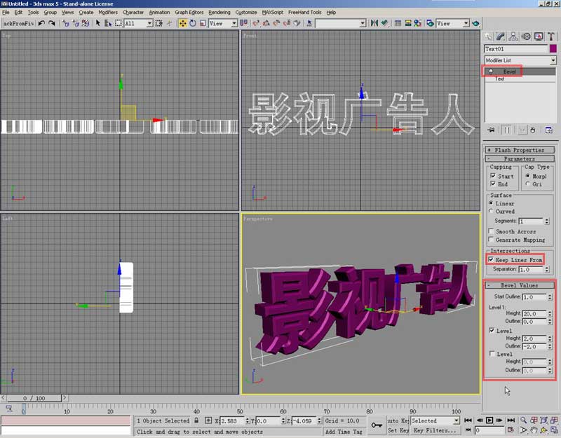 切换到修改面板,添加bevel导角修改器,参数设置参考图例,通常不看文字背面所以只让前面出现导角,若文字出现破面,可勾选 keep lines from……项,通常就能解决问题。