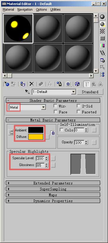 打开材质编辑器,shader类型选metal金属,设置如图。