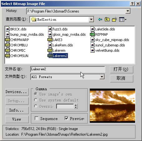 从文件选择路径窗口中找到max安装目录下的maps文件夹,在reflection文件夹里面选择lakerem2.jpg文 件,这张图很适合作金黄色金属贴图。