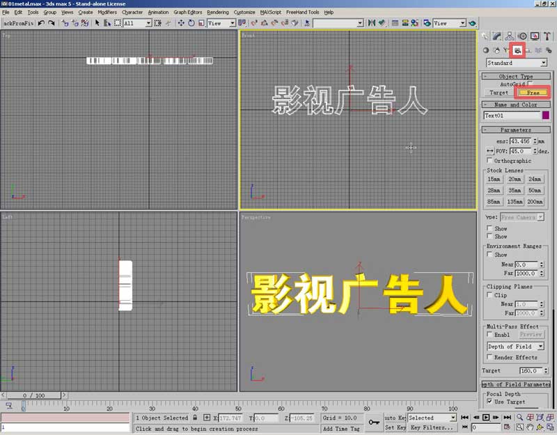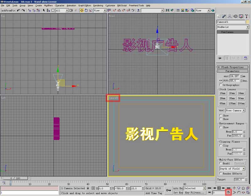 首先建立文本,做成导角金属字,或者别的什么。然后放置一架摄像机,选用free自由相机,在front前视图中点击。