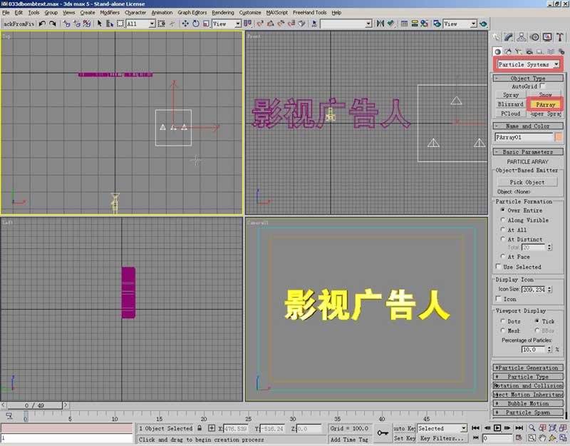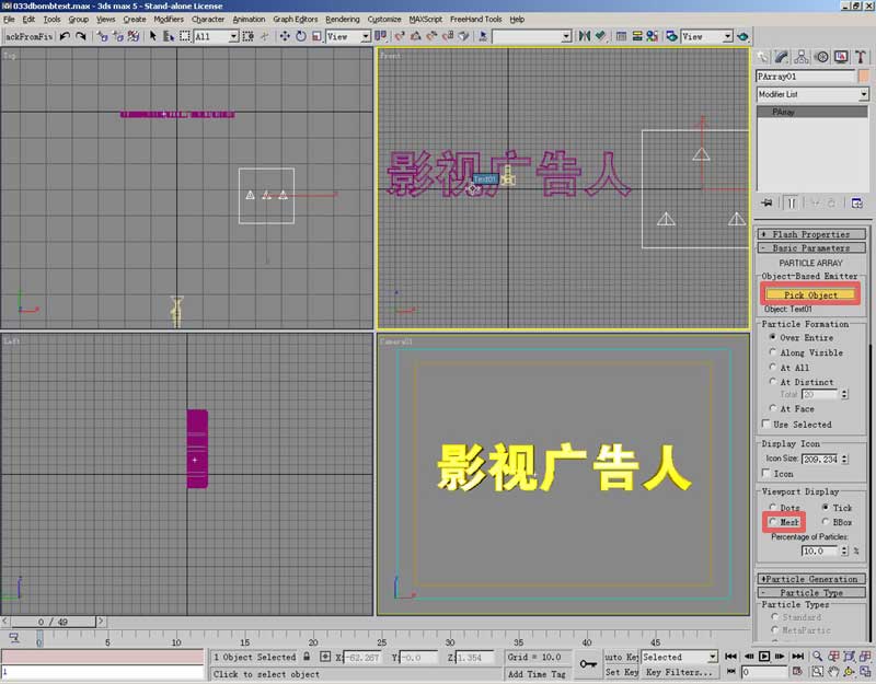 在PArray的控制面板上,按下pick object按钮,为粒子指定发射器,到视图中点击文本物体,你会看到文本的名称出现在按钮下方。粒子显示方式可选择mesh项,这样会把形状显示在视图中。