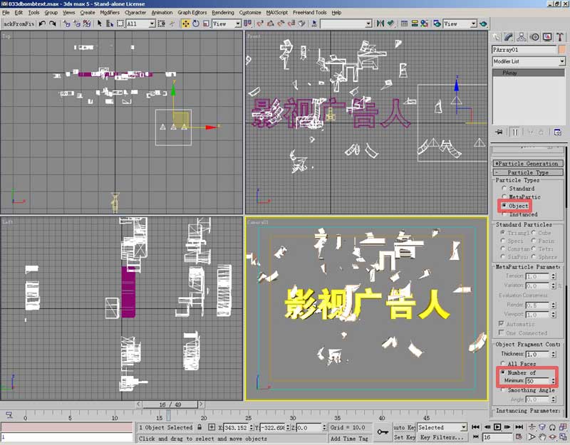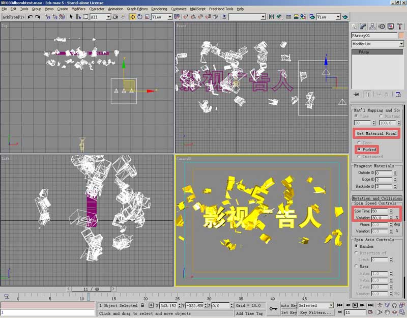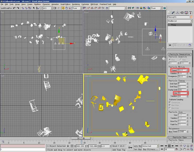 回到PArray面板上部,调整粒子基本参数,life控制粒子的生命值,我们可设定存活50帧,然后可拖动时间滑块观察, 调整speed粒子速度,到动画结束时刚好碎块要飞出画面。