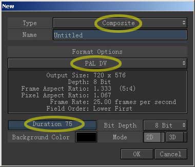 弹出窗口进行设置,type类型选择composite合成,选择PAL DV制式,duration持续时间设为75帧,也就是3秒钟。这里在输入参数时有三种方法,在参数框上按住鼠标拖动可增加或减少数字;点击一下会变为可输入方式,直接用 键盘敲击数字即可;双击这个框可弹出类似于计算器的键控窗口,在上面点击相应数字然后按确定就行了。设定好,点ok创建这个合成项目。