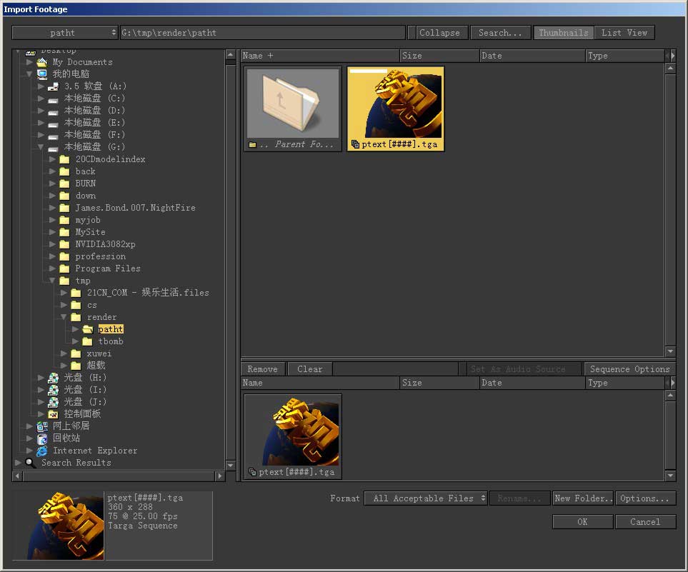 出现如同资源管理器的窗口,到目录中找到欲植入的素材,combustion有个特点,在素材缩略图上按住鼠标拖动可以预览 动画。选中素材,按下ok把它导入。