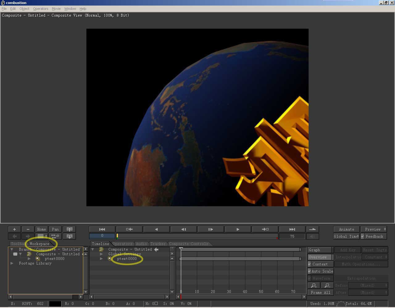 现在我们看到视图中有图像了,combustion是以层的方式进行合成的,一个素材是一个层,这一点我们会从 timeline时间线编辑窗口中看到,素材的名称也出现在那里,点开它的小三角,会打开被折叠的各项元素。左边workspace工作区,起到导航的作 用,合成中的各个元素都被以层级树的形式显示在这里。