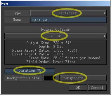 弹出窗口进行相应设定,type类型选择particles粒子,我们要用到combustion先进的二维粒子特效,下面 制式、持续时间都跟本合成项目的设定一致,transparent控制着这个层是否是个透明层,这里我们选择不透明,把前面的对勾打掉。按下ok。