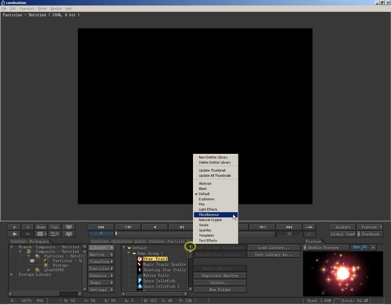 现在我们已经进入粒子层中了,这可从视图左上角名称看出来。下面的控制区自动换为粒子的参数面板,combustion提供 了丰富的粒子特效库,点击任何一种,它的缩略图就会显示在屏幕右下角的预览窗口中,在这里我们可以观察效果。点开图中所示的小三角,出现粒子预设类型的分 类,选图示那一项。