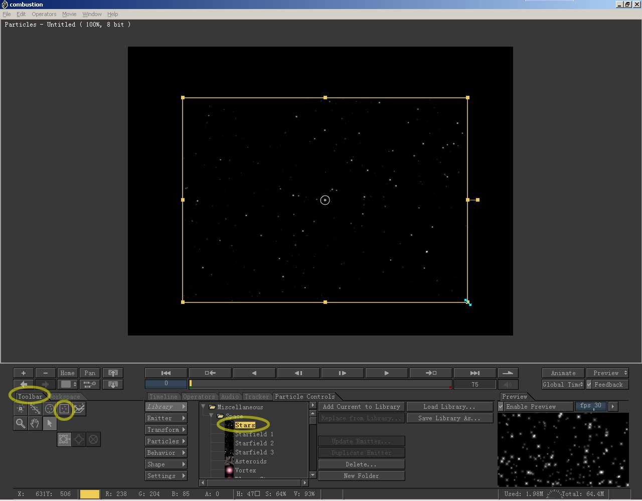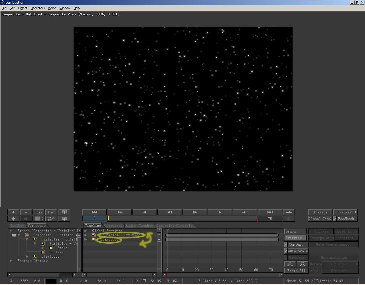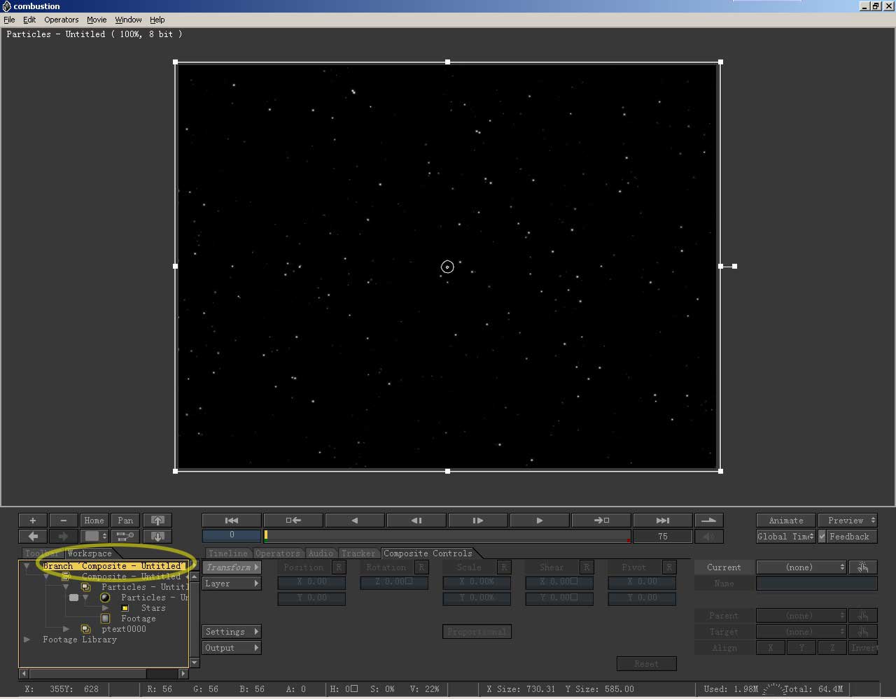 调整矩形框的控制节点,使画面扩展到整个视图,星空建立完成。控制区切换到workspace栏,在层级最上端双击鼠标,退 出粒子层。