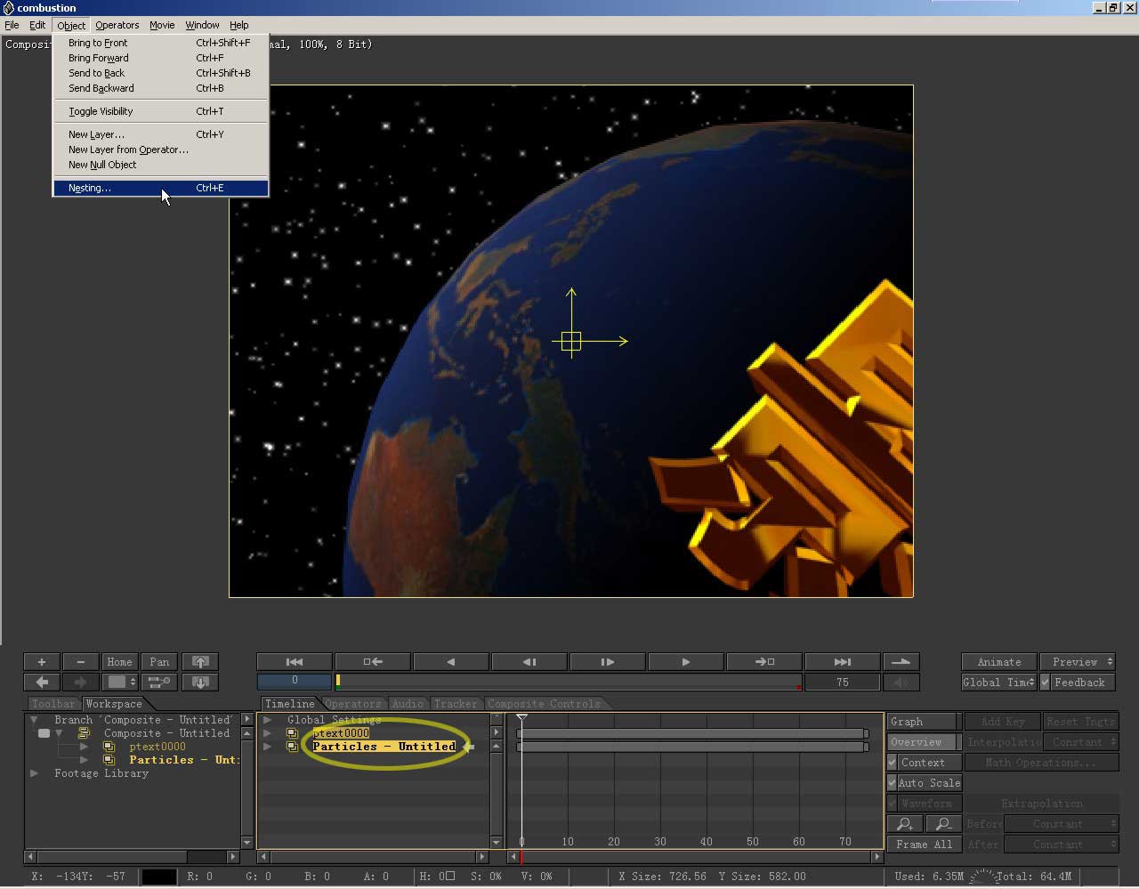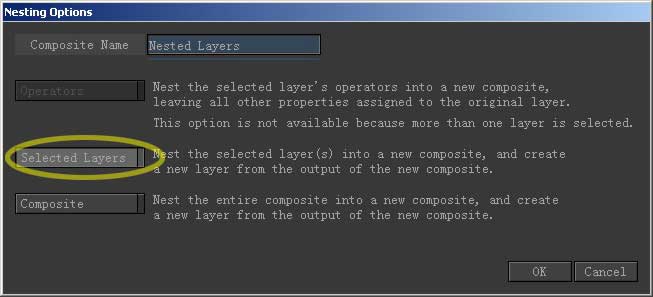 现在顺序正常了,同时我们已进行了必要的合成。下面我们再给这个合成添加一个滤镜特效。为了使这个特效作用于整个画面,需要 把那两层合并。把两个素材层选中,到object菜单点选nesting。