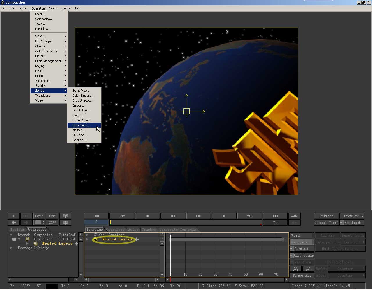 这样两层合为一层了,选中这一层,打开operators菜单,在下面滤镜中选择stylize\lens flare,添加一个耀斑特效。