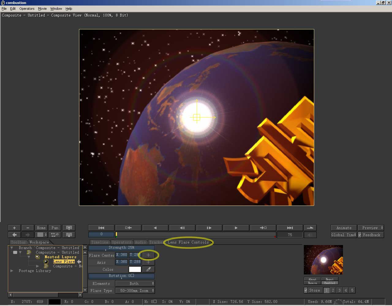 特效已被添加,再进行一番设置。下面的控制面板自动切换为lens flare的,如果你不小心换为别的什么也没关系,可通过左边的workspace工作区找到这个元素就行了。在lens flare的控制面板上,按下flare center右边的十字按钮,用以调整耀斑中心。