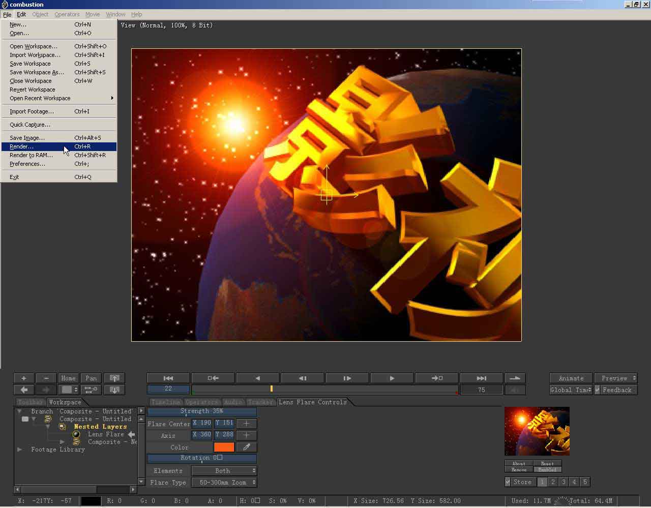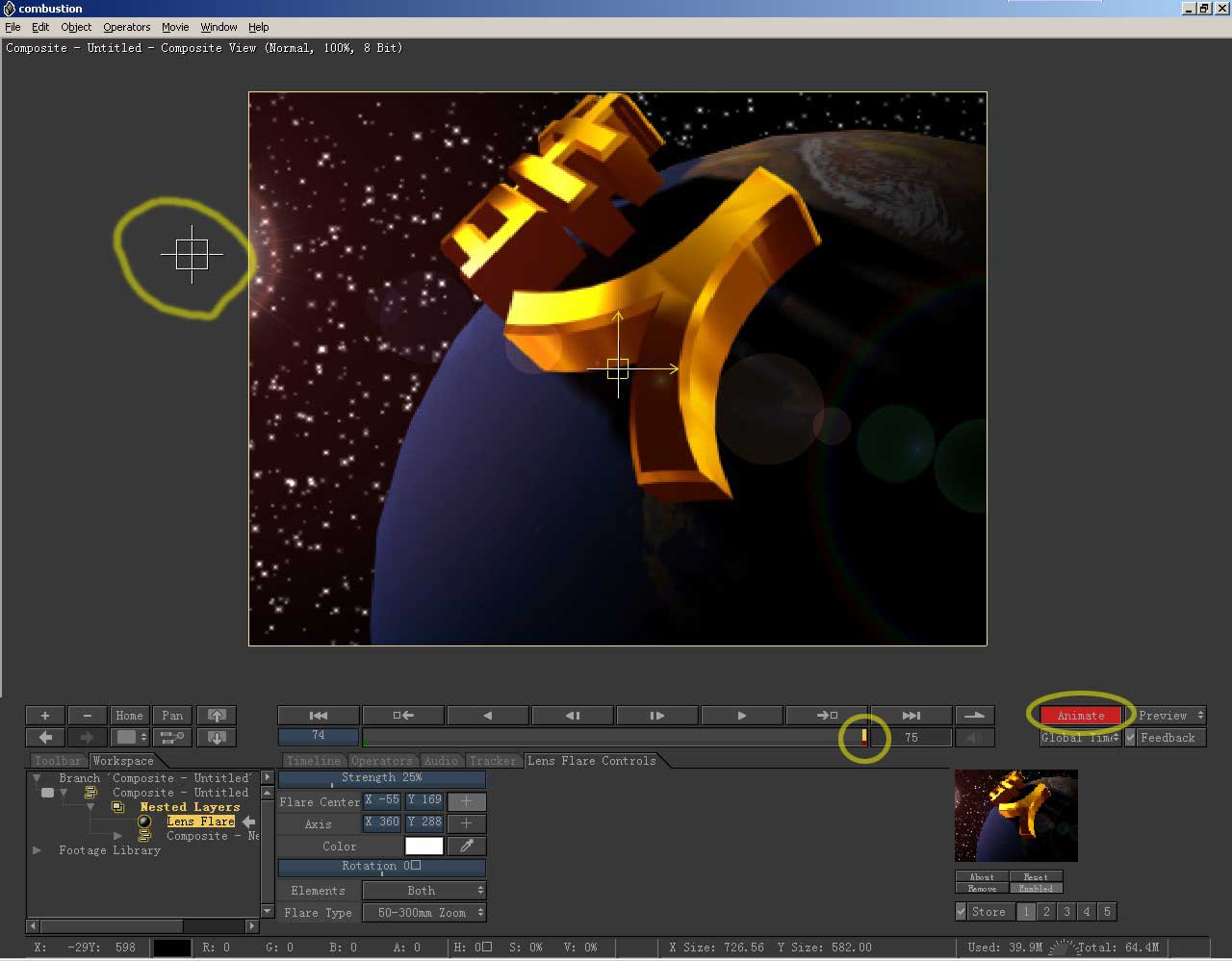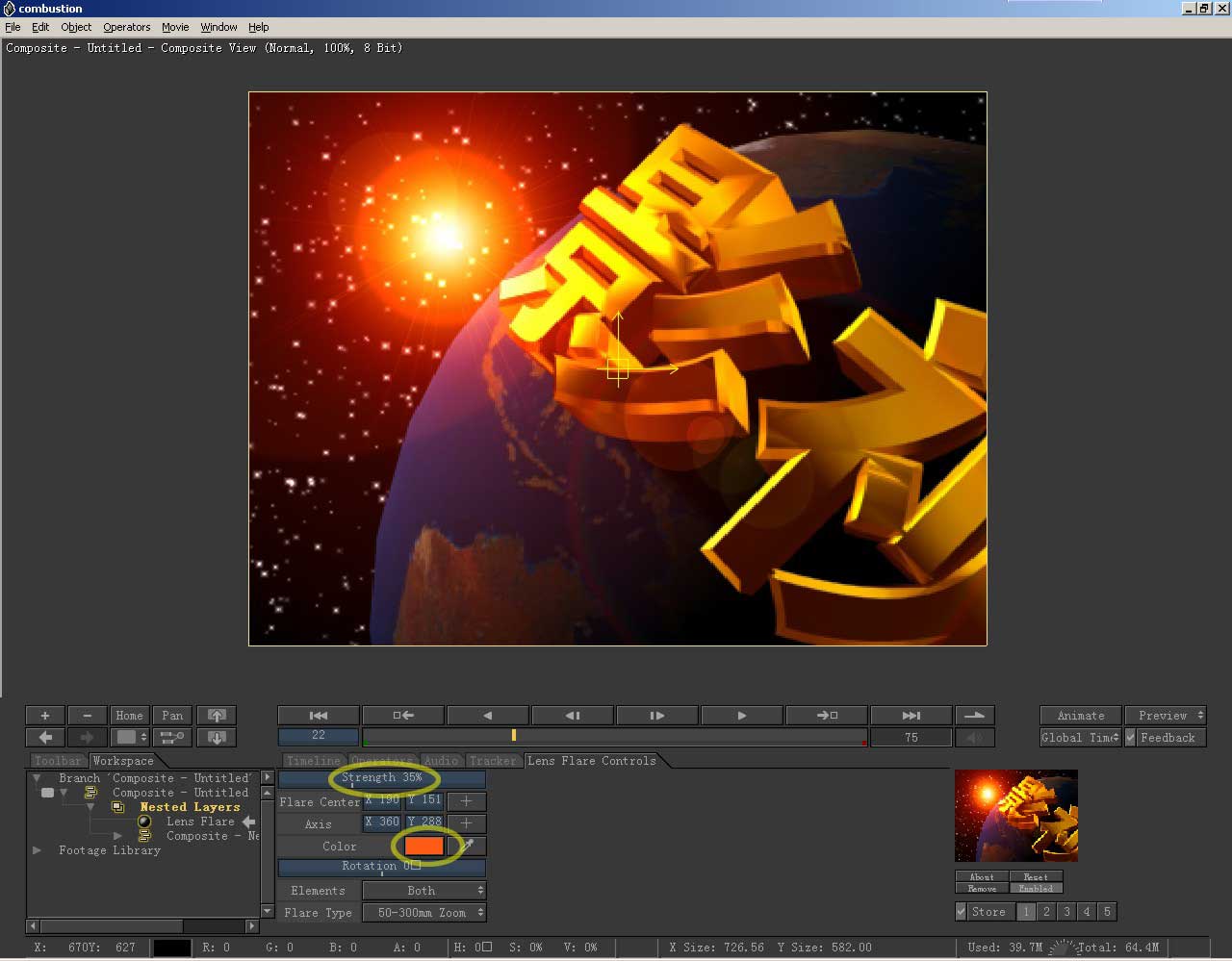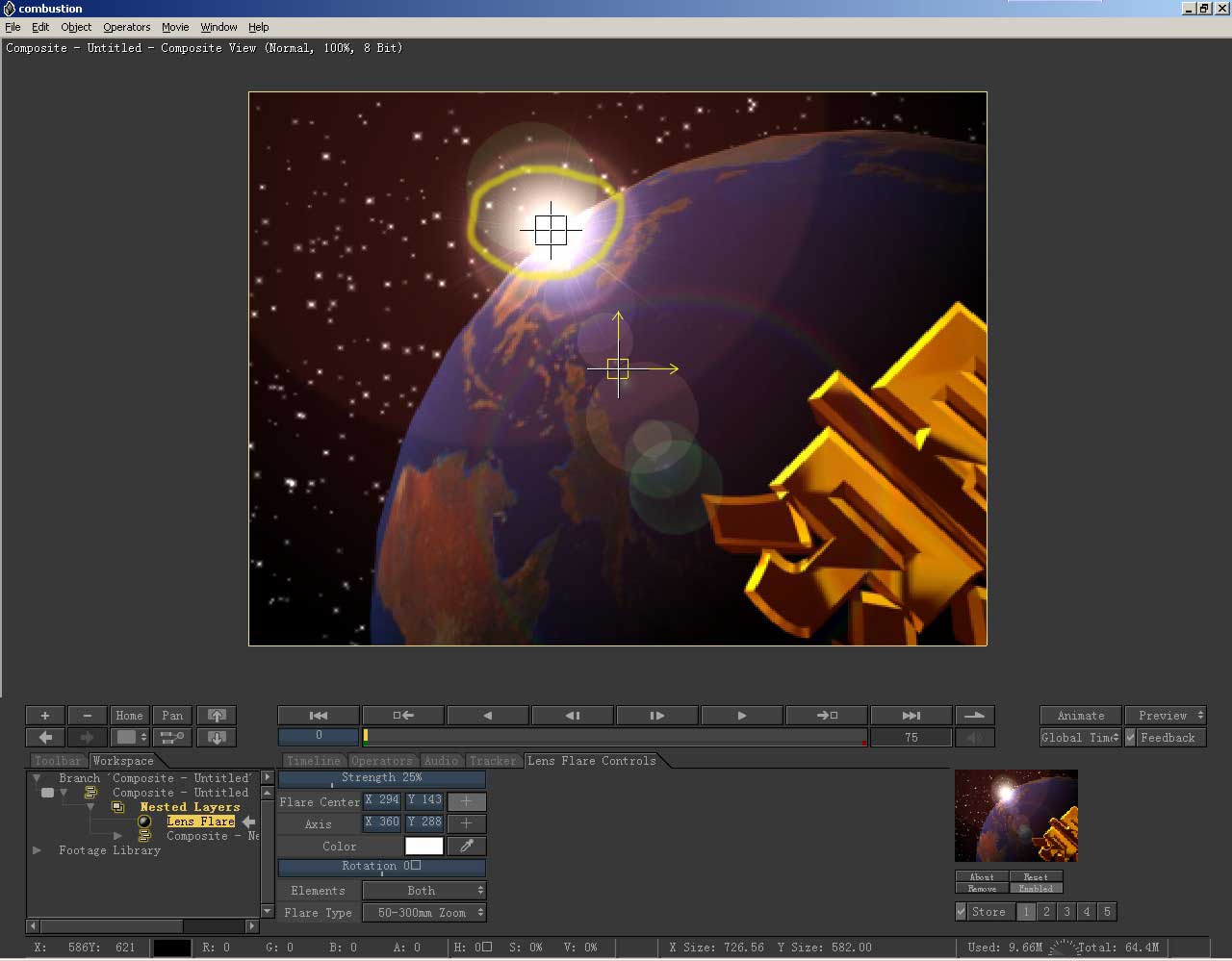 到视图中,按下鼠标拖动,把耀斑放到图中地球的边界,让它在这里开始出现。
