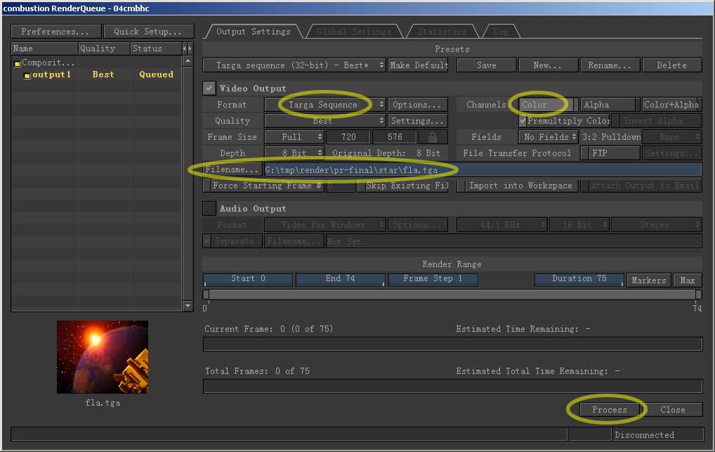 出现渲染设置对话框,格式选择tga序列,右边通道设置选color就行了,因为这回我们不要通道,点开filename选 择输出路径并取文件名,最后按下process就开始生成动画了。