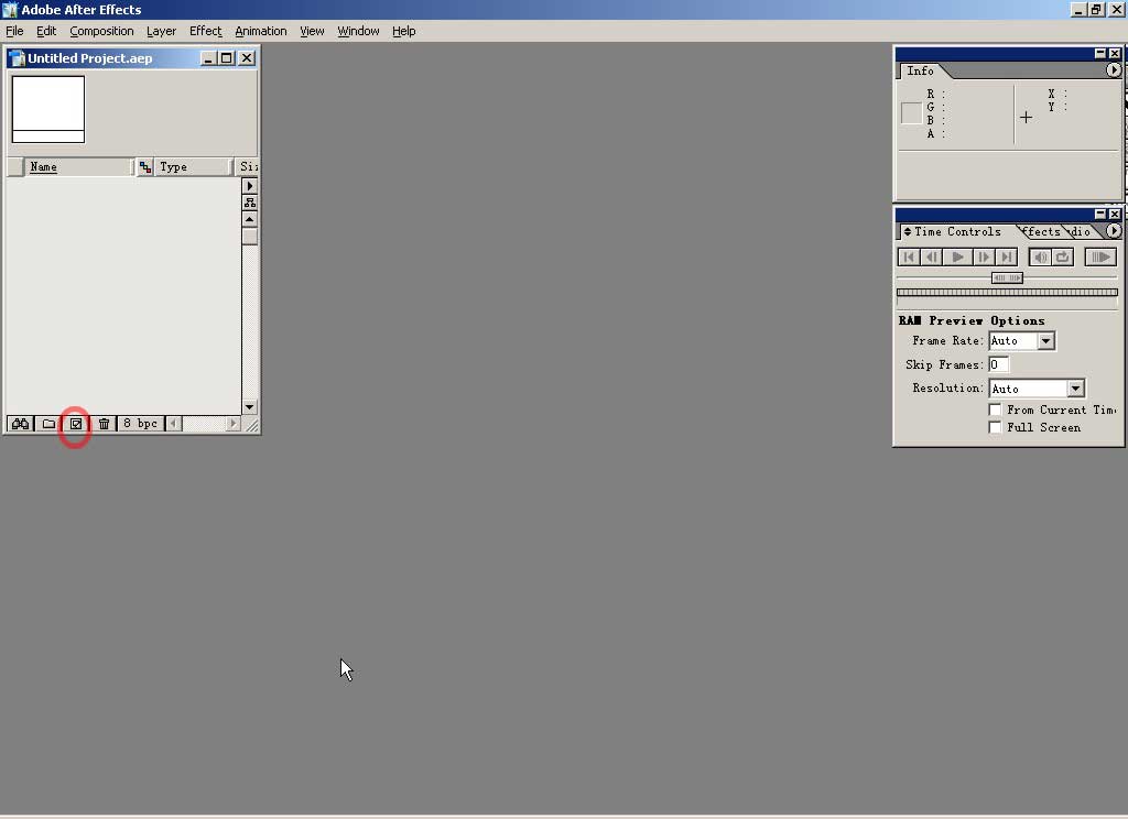 启动after effect,在project项目窗口按下图示按钮,建立合成。