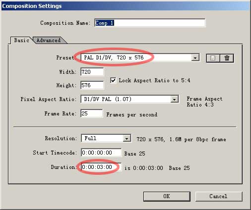 弹出设置窗口,选对制式和尺寸,在持续时间框中设置3秒钟的动画。