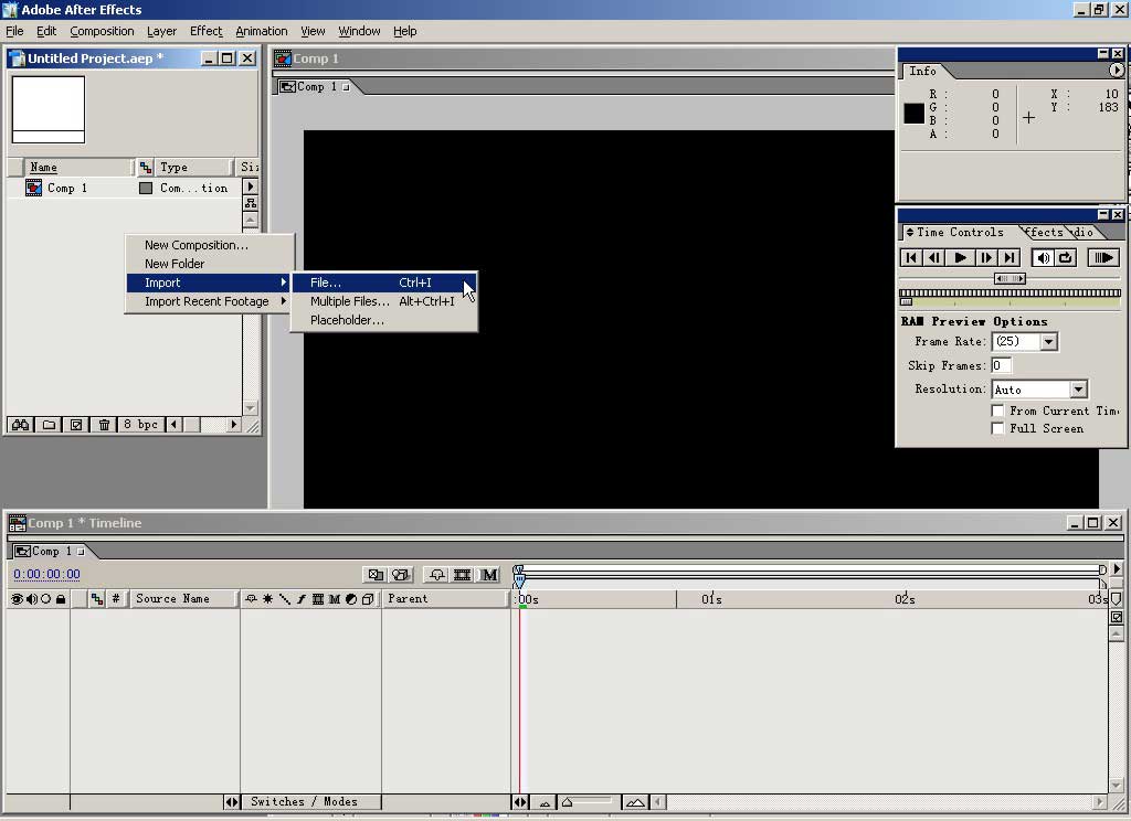 此时的合成是空的,然后导入素材,在project窗口中右击鼠标弹出快捷菜单,选择import\file导入文件。
