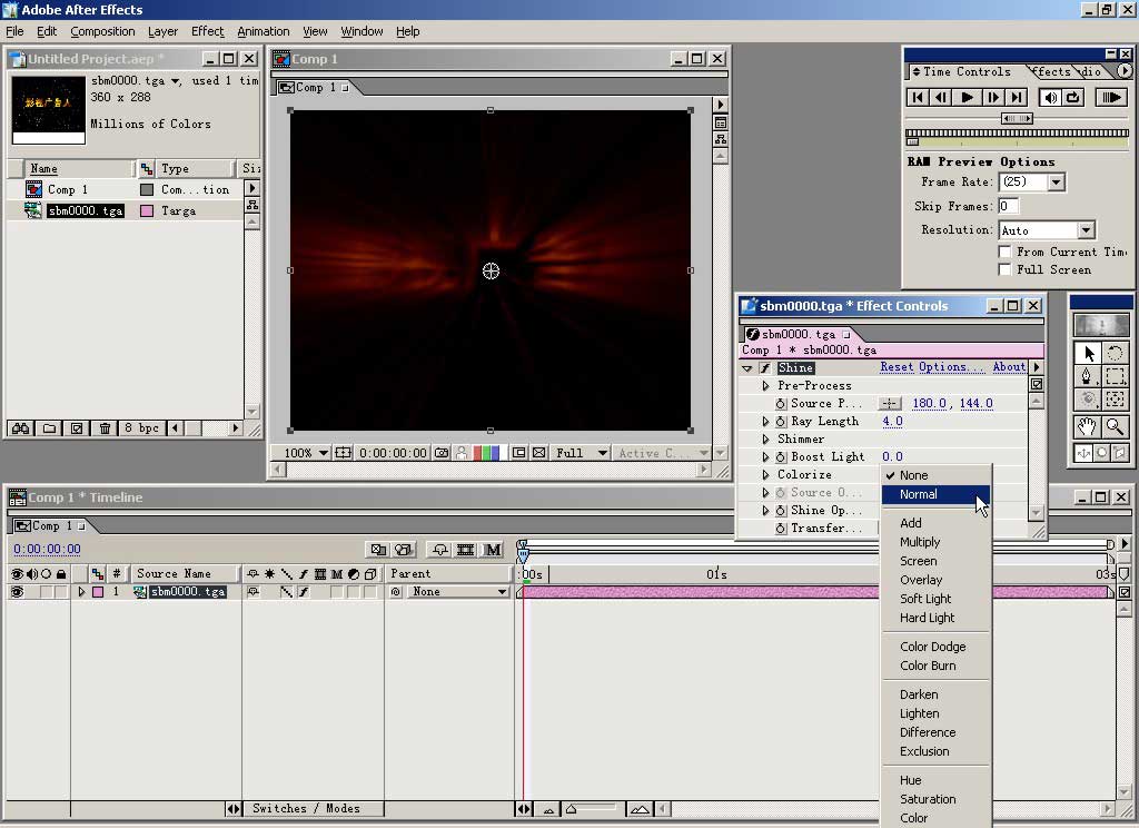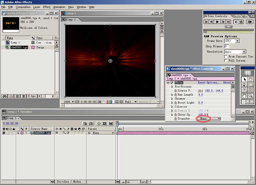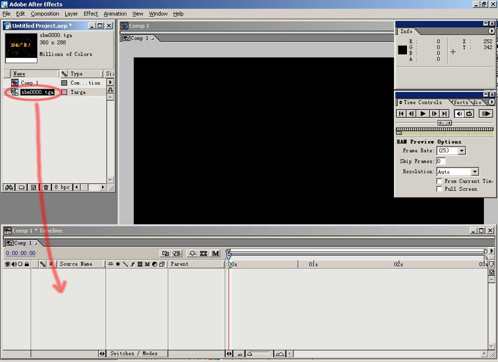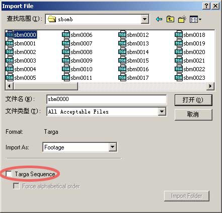 找到我们做好的素材,我们使用前一实例中作的爆炸字,选中第一帧,按下打开按钮。这里我们只用这一帧,如果勾选了下面的 targa sequence就会把所有序列帧合为一个动画文件导入了。