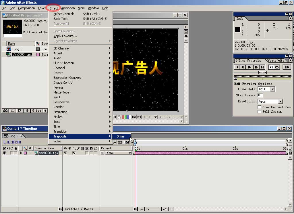 现在可以在预视窗中看到图像了,在素材被选中的状态下点击effect效果菜单添加滤镜特效,从中选择 trapcode\shine。