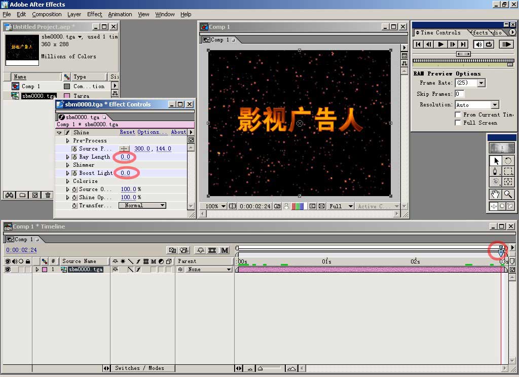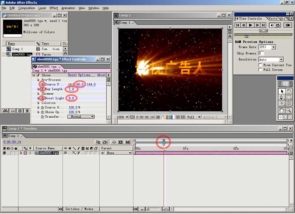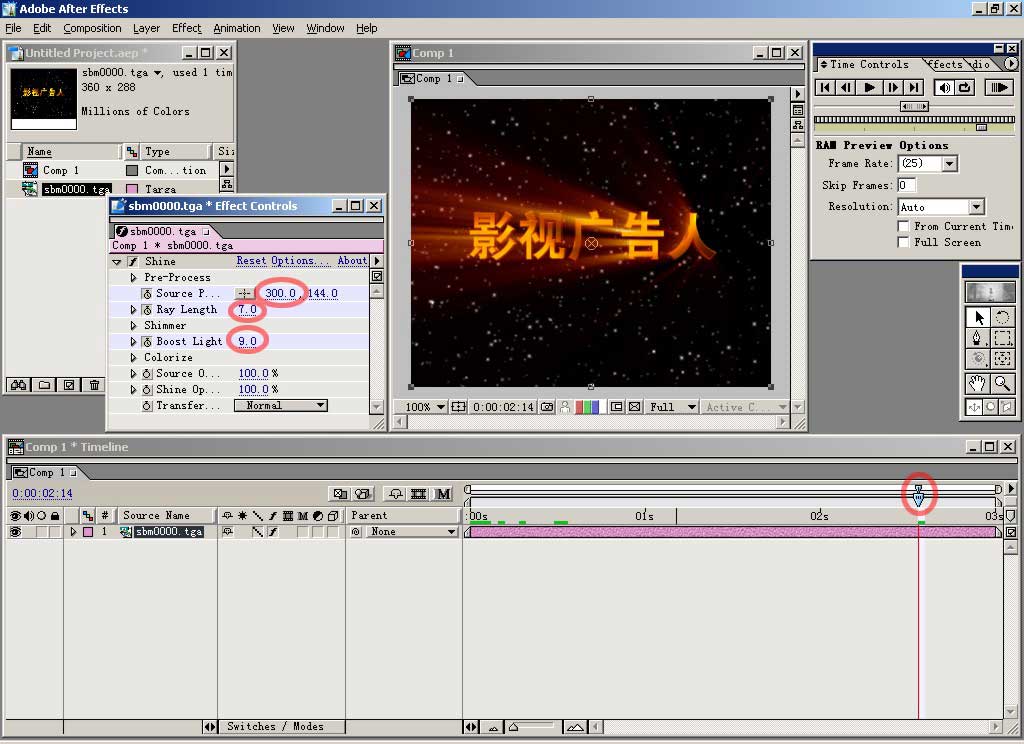 然后对shine做动画设置,在timeline时间线编辑窗口中把时间定位装置移动到图示位置,到effect contrals控制面板中,按下左边带有钟表图标的几个按钮建立关键帧,然后把其右边对应的参数更改,多少你可根据情况而定,从预视窗口观看效果,ray length控制射出光线的长度,boost light控制光线的强度,source point控制发出光线的中心位置,在这个时间点,我们把光线中心定位在最左边的字。在面板上更改参数有三种方式,点击一下参数位置会变为可输入状态,用键盘输入;在参数 上按住鼠标拖动会直接改变数字;点开参数项左边的小三角,会展开这一部分,出现滑动条,移动定位点就会改变参数大小。