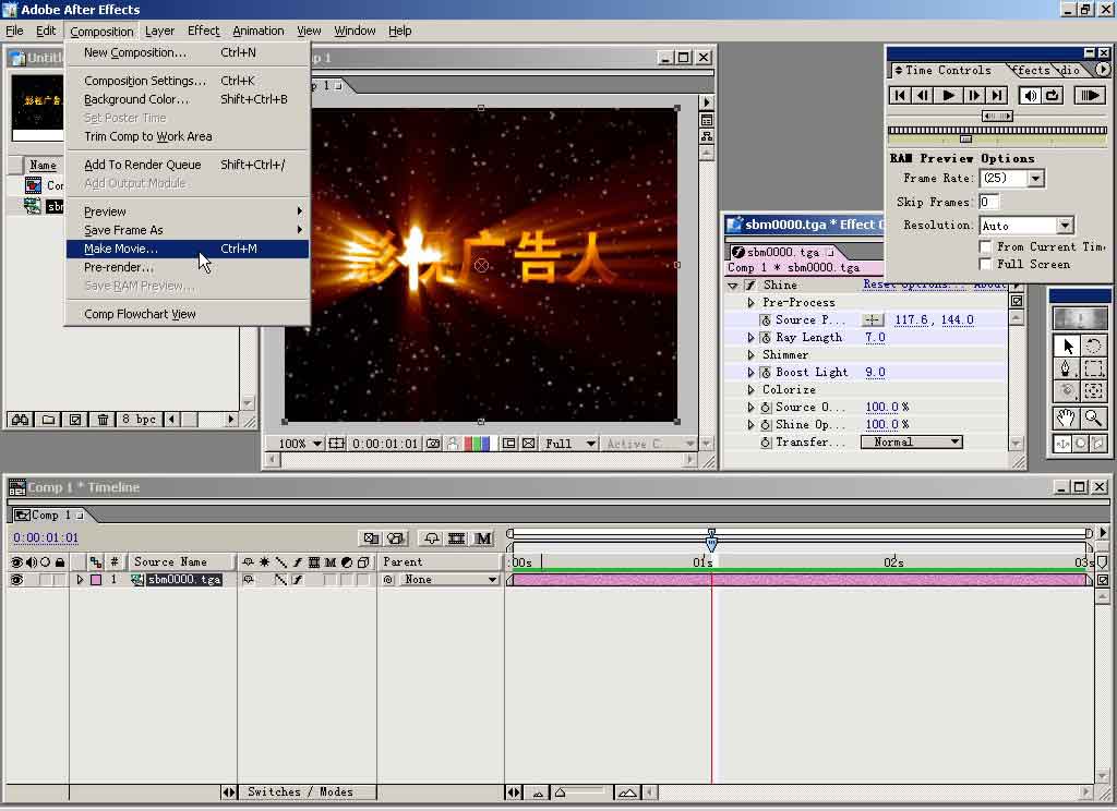 好了,动画设定完毕。打开composition菜单,点选make movie生成动画。