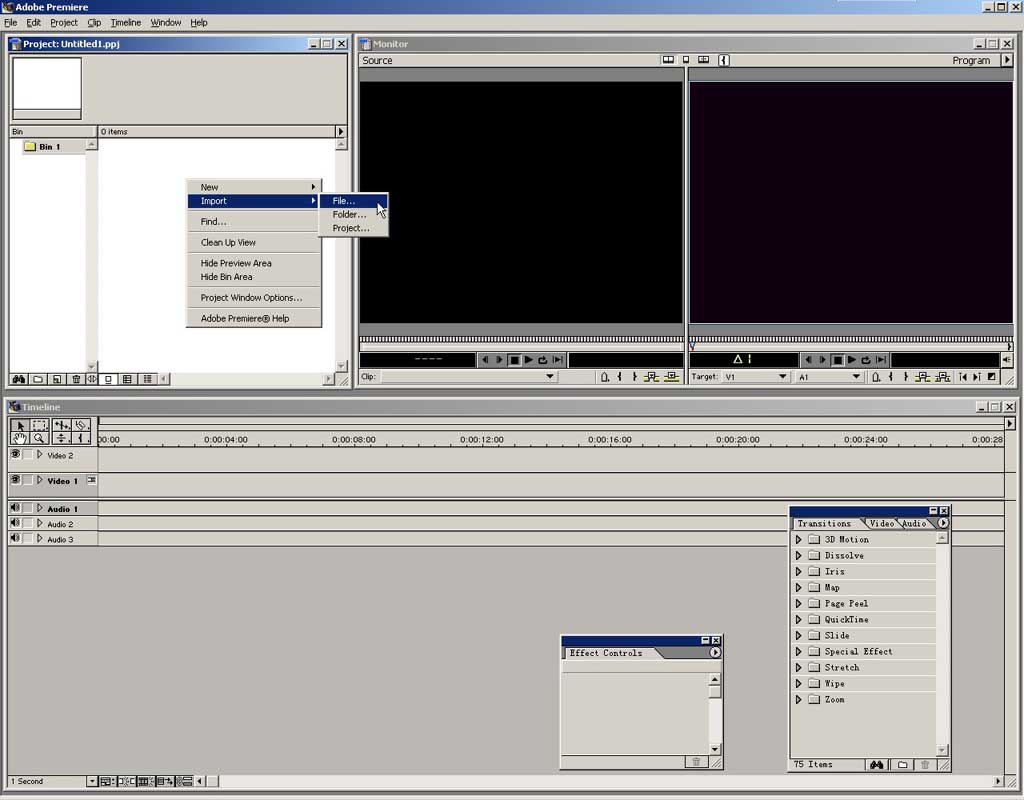瞧,这就是premiere的工作界面了,包括projiect项目窗口、monitor监视器、timeline时间线编辑窗口,和几个控制面板,这个界 面可以被你更改的。在project窗口中右键点击空白处,弹出快捷菜单,选择import\file导入素材。