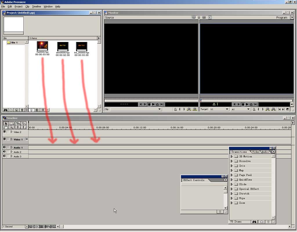把要用到的文件依次导入,出现在project窗口中,然后分别把它们拖入timeline窗口中。