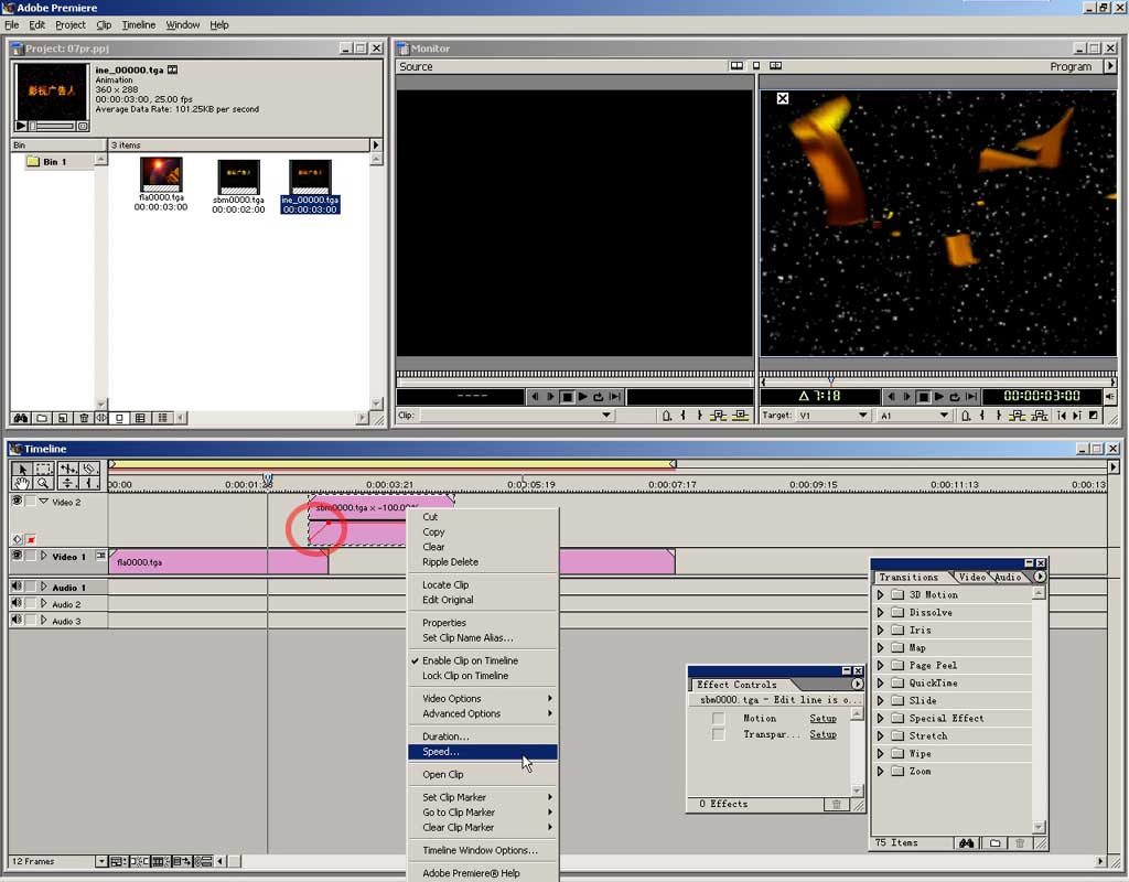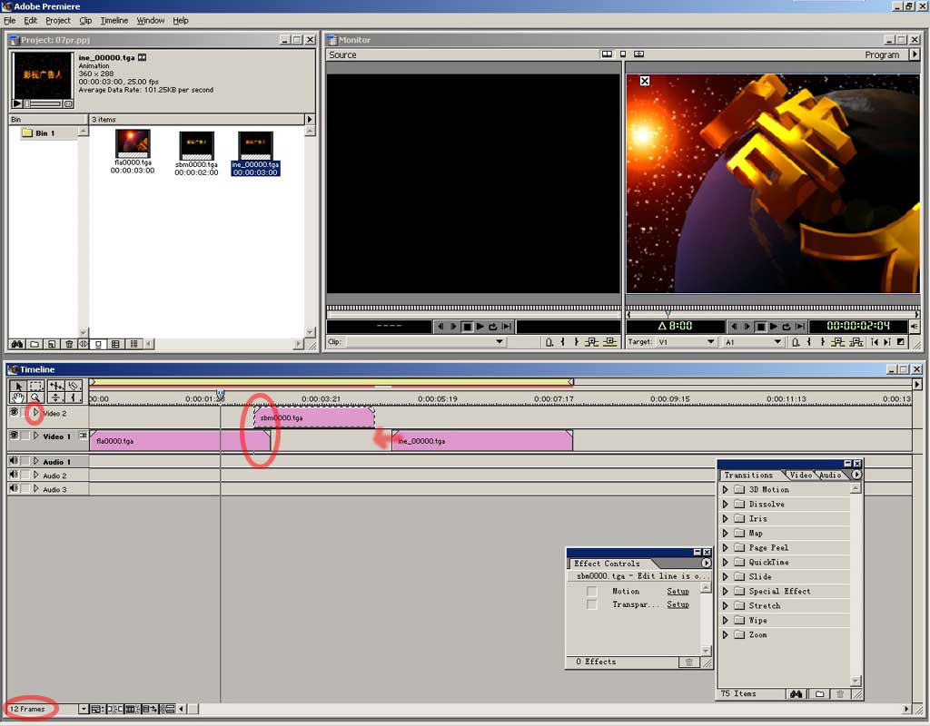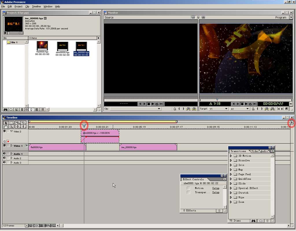 可按住alt键在视图中拖动时间定位器来观看效果。后面我们还要做一个转场效果,premiere提供了专做转场的轨道,但现在并未显示出来,请点开 timeline窗口最右边的小三角。
