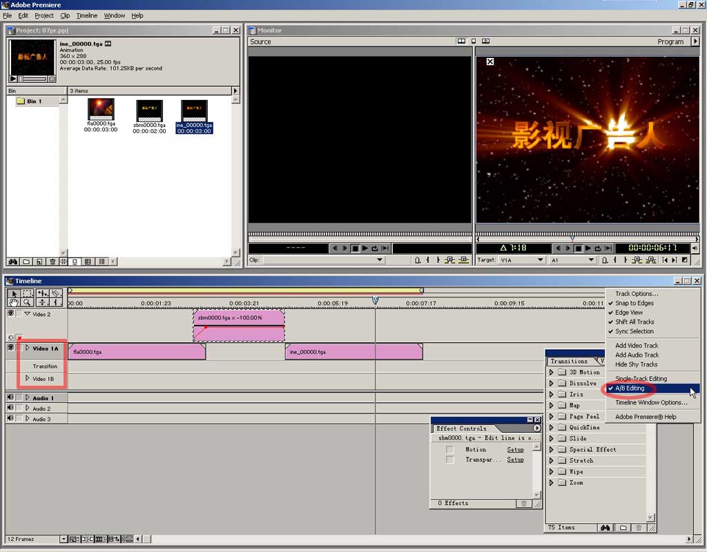 从中勾选a/b editing,在timeline中出现了video 1a和video 1b的轨道,这两轨之间的是transition轨道,用来放置转场特效。