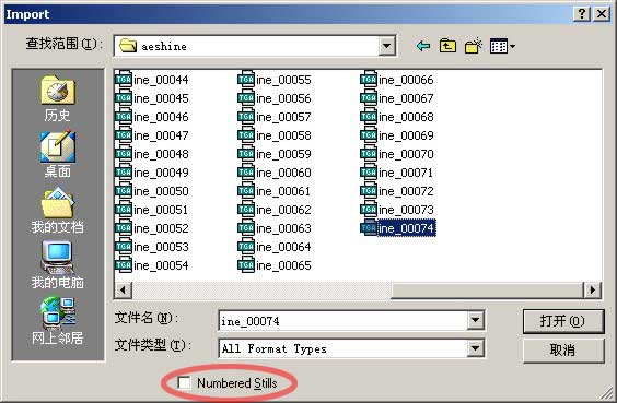 找到制作好的文件位置,对于序列帧,选中第一帧,然后勾选numbered stills,按下打开,就会把所有序列帧合为一个动画文件导入了。