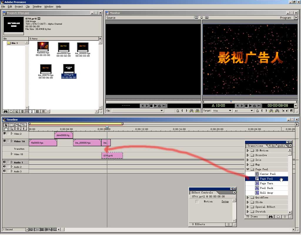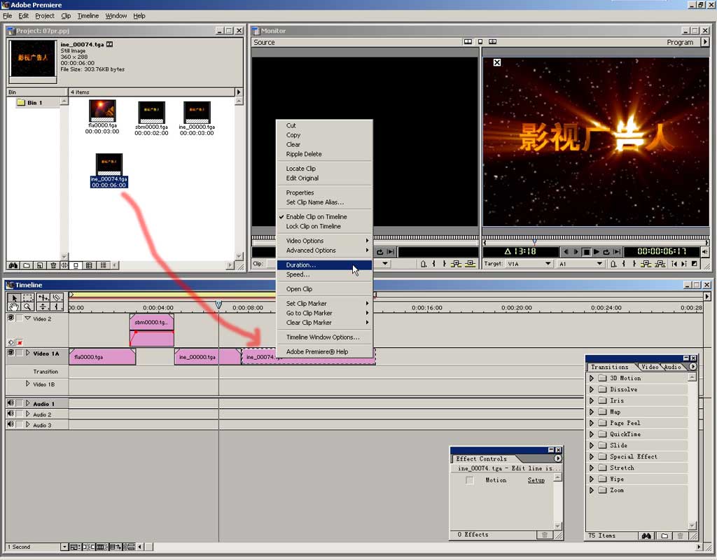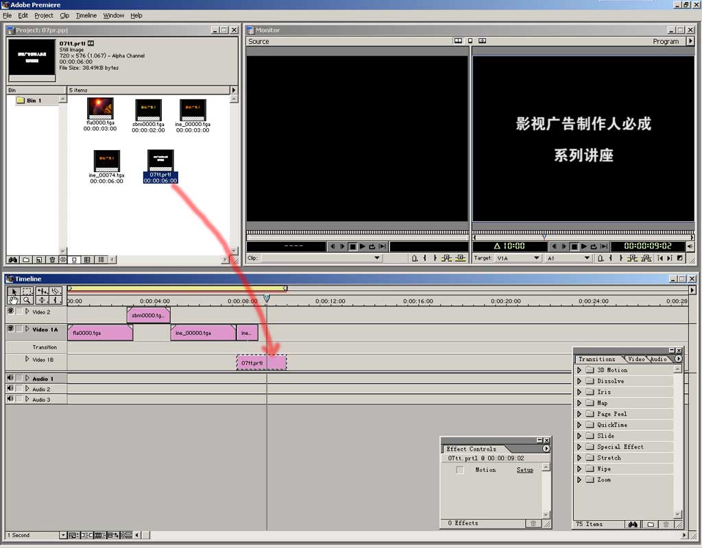 字幕文件会自动出现在project窗口中,把它拖到编辑窗中。注意位置,开始端与上面的静帧素材对齐,字幕的持续时间也可更改,把鼠标移到文件右端会改变 形状,按住拖动就能交互的改变素材长度。