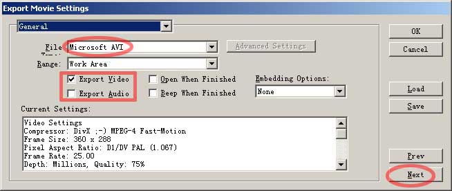 选择想要输出的格式,我们没有配音,所以不选export audio,按下next进入下一栏设置。
