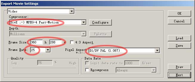 视频的具体设置,选择相应压缩格式,画面尺寸、速率、像素比。