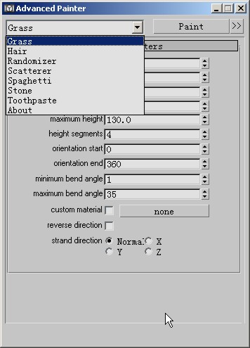 在advpainter的面板上打开下拉式菜单,会看到多种创建物体和方式,