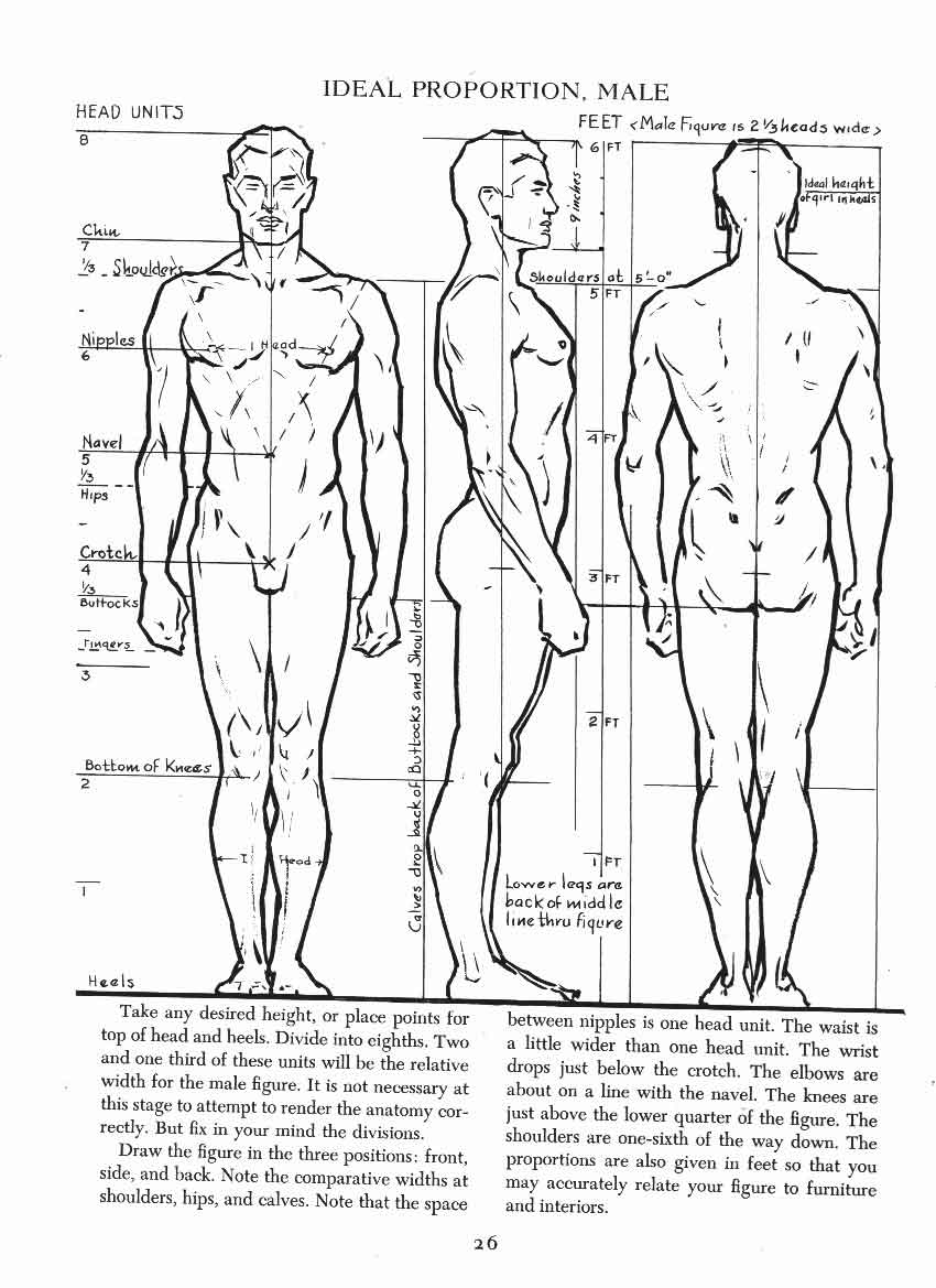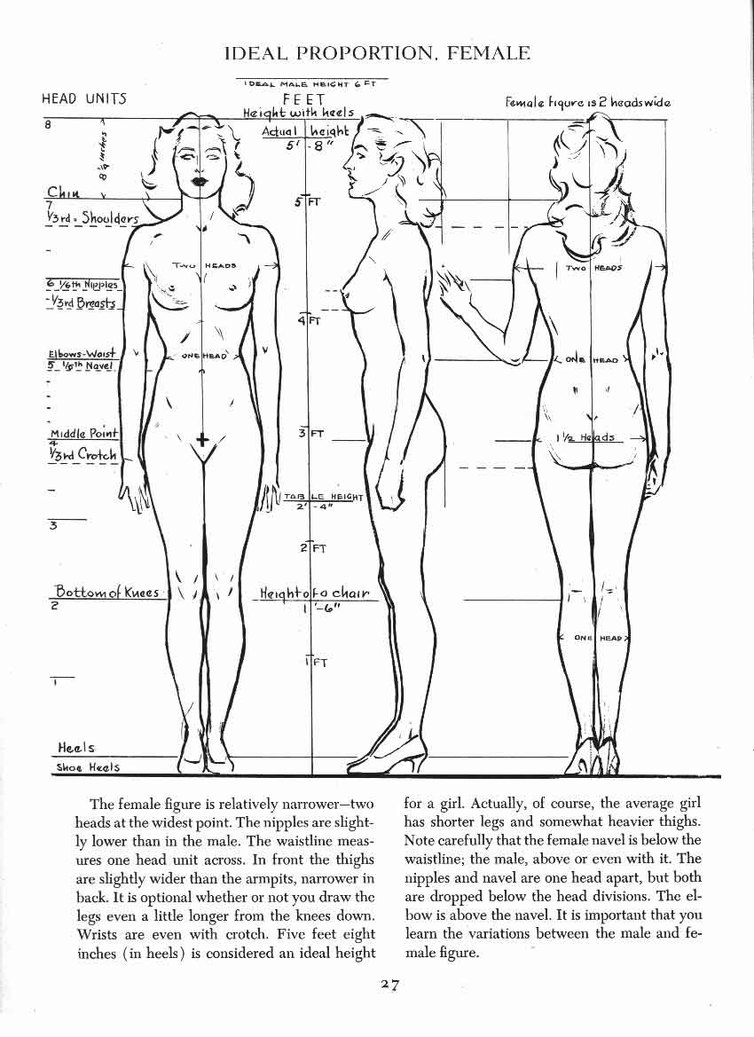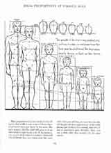 这是女人体的比例图,通过跟上图的比较可以证明,男女有着不同的比例关系。 |