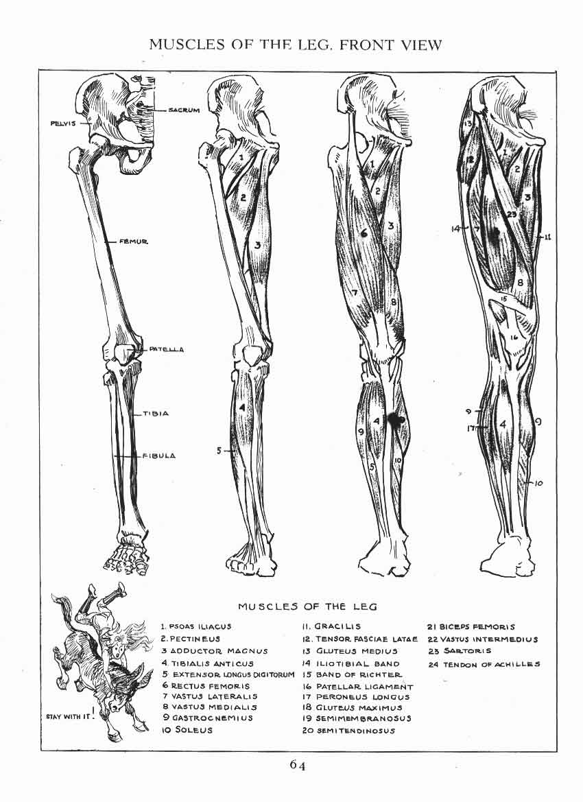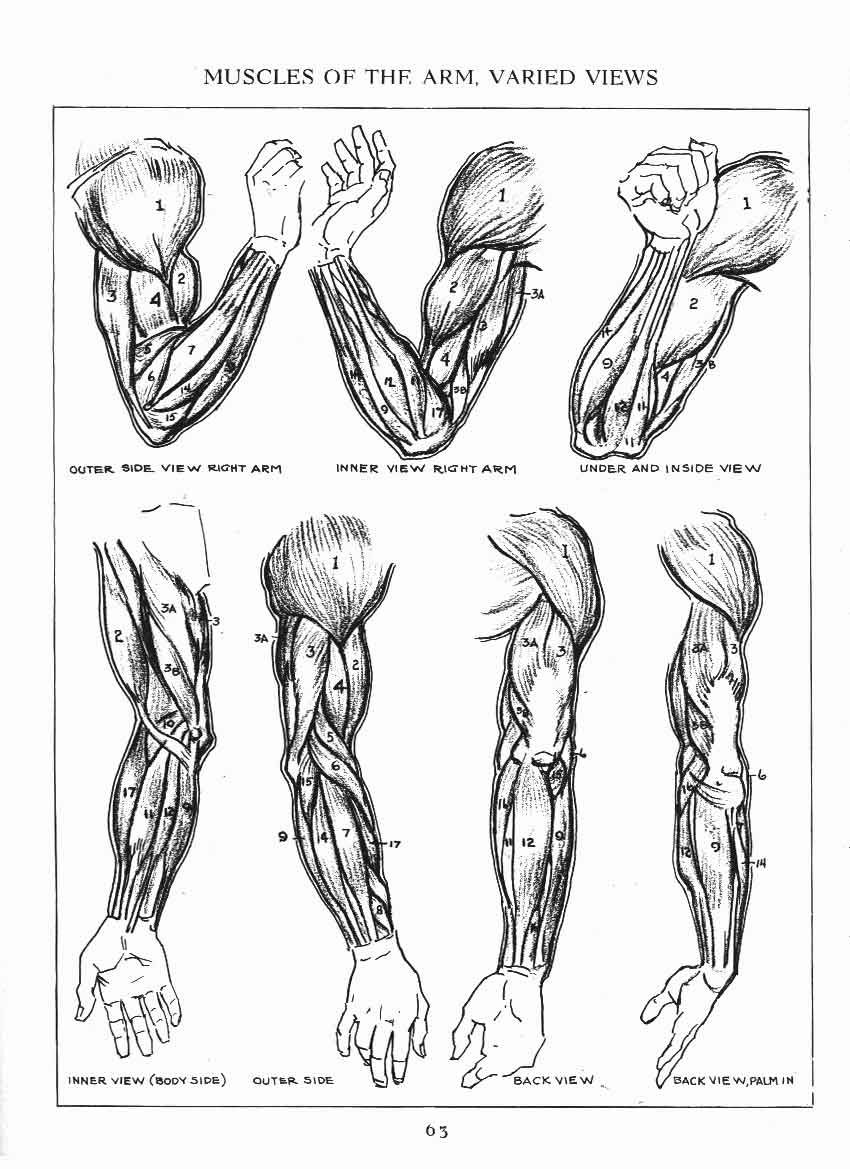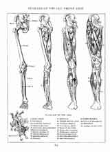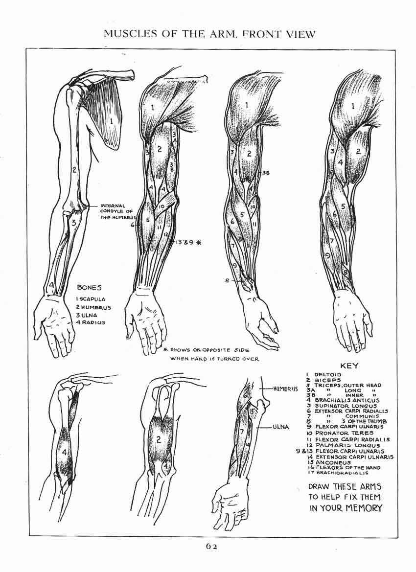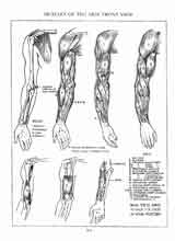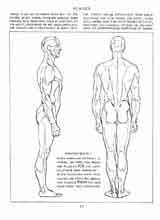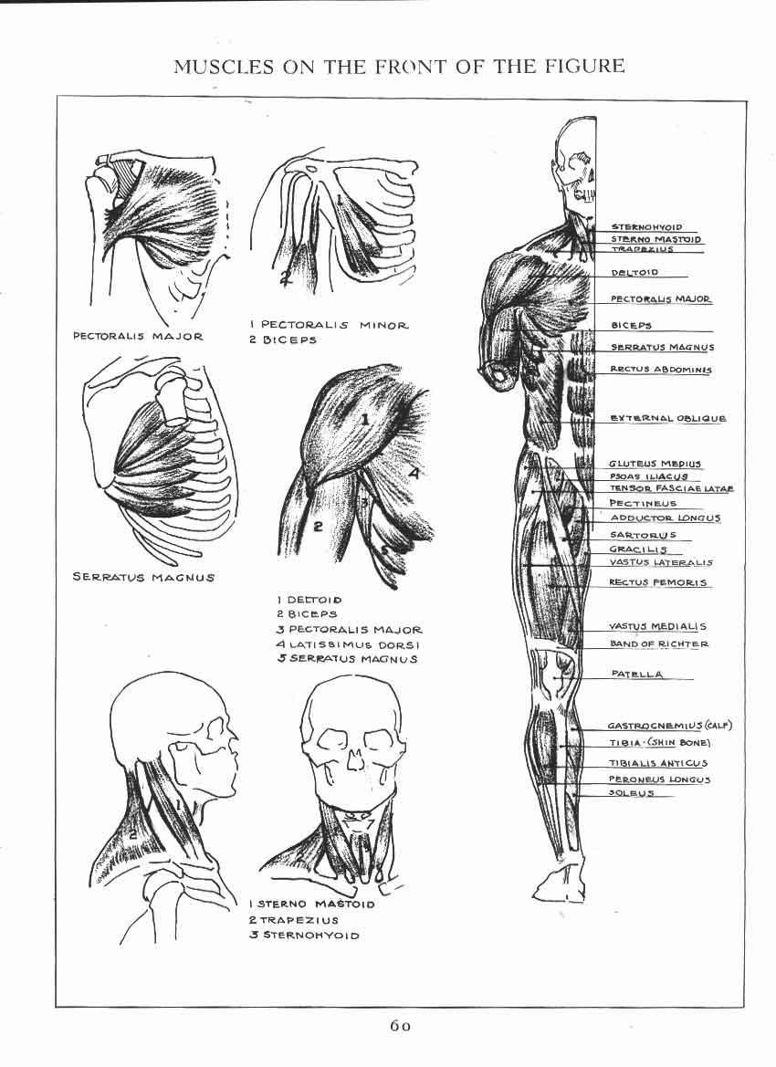 正面肌肉图,骨骼和皮肤之间的部分,是决定外形的。也由于肌肉的牵拉收放,形成人体的动作,并且会有形态的变化。 |