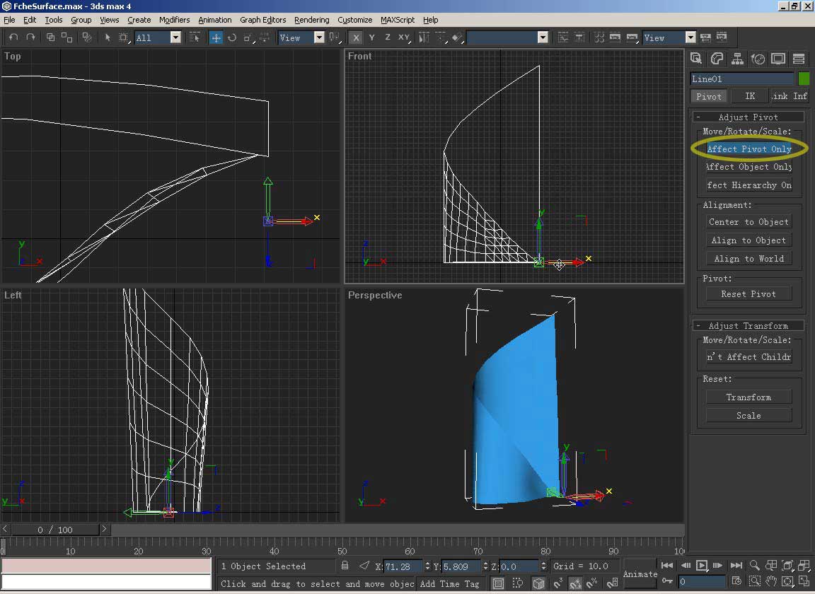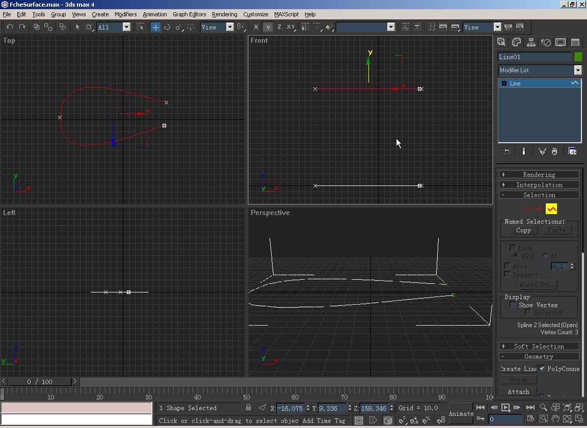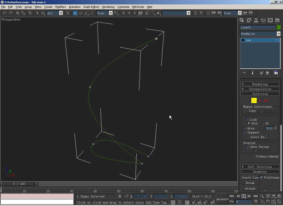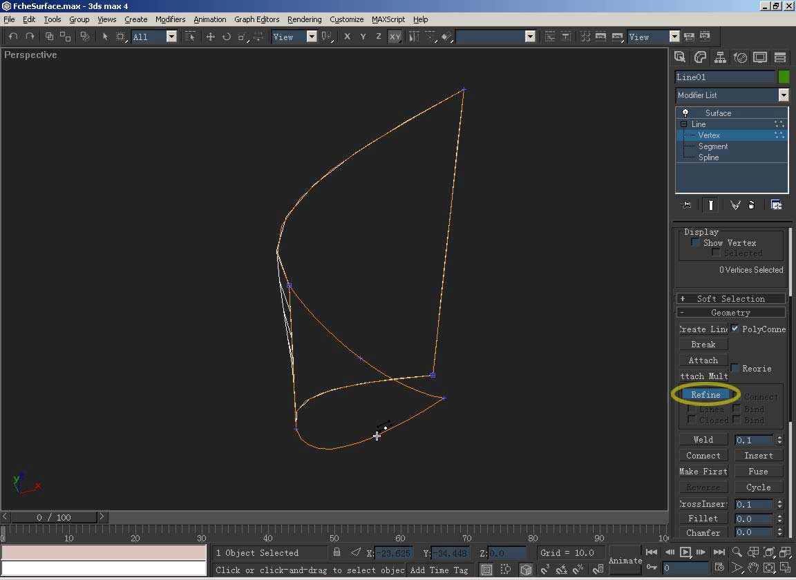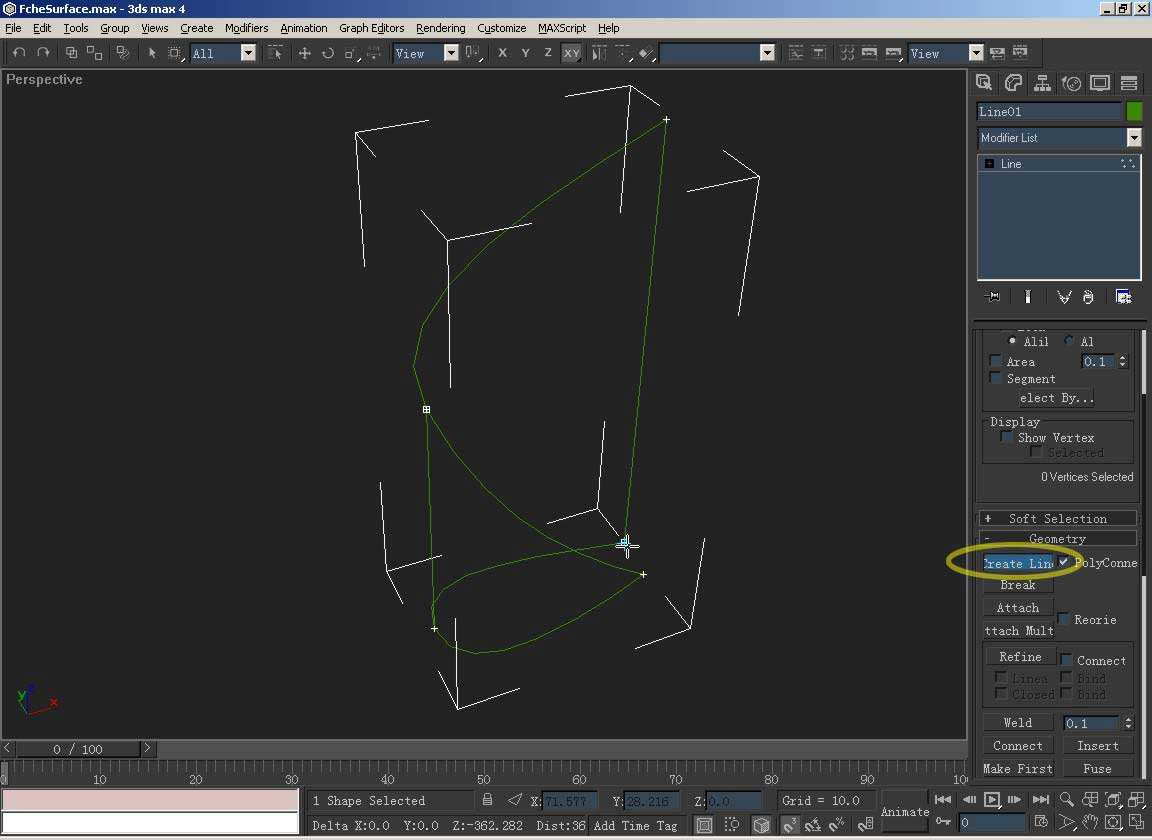 仍然保持在子集中,按下面板上的创建线条按钮,在视图 中点击,如图把顶点连接起来,此时由于启动了顶点吸附,新创建的线段端点会自动吸附到欲连接的顶点上。这样做是为了下一步使用 surface命令正确表现,因为surface的工作原理是,line必须组成四边形或三边形。