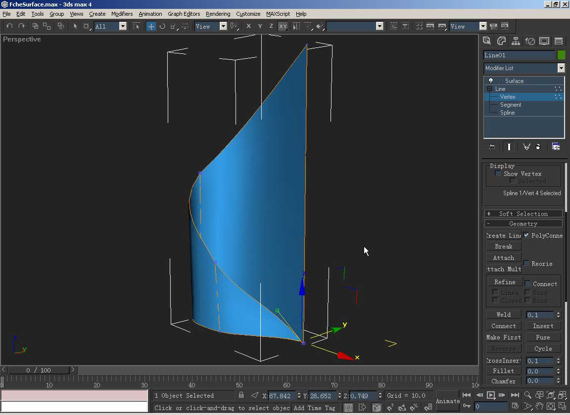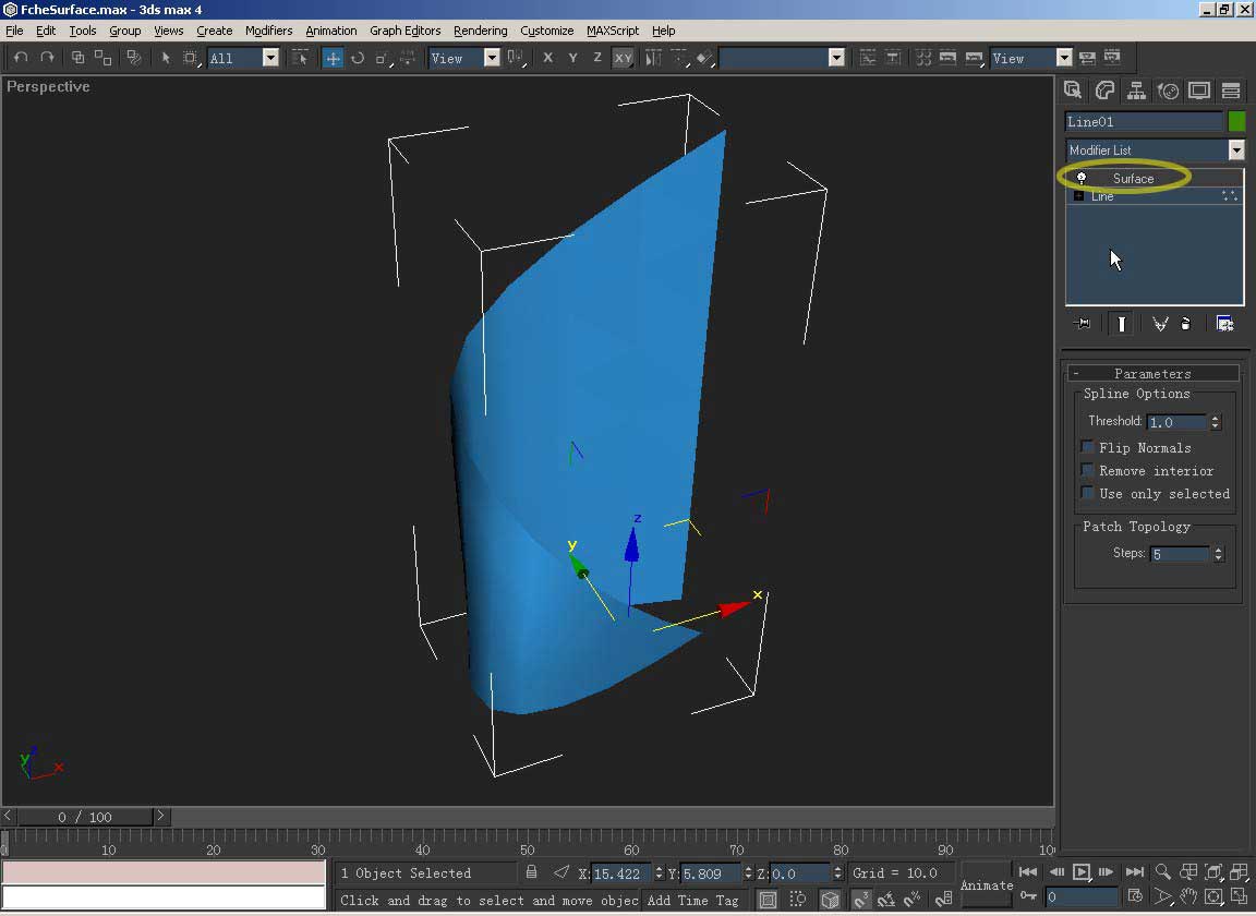 关闭物体的子集回到最上层,添加一个surface修 改器,瞧,面已被创建!同时可以设置物体两面都可见,或是干脆指定一个材质赋予物体,在材质编辑器中的物体材质上勾选两面可见。