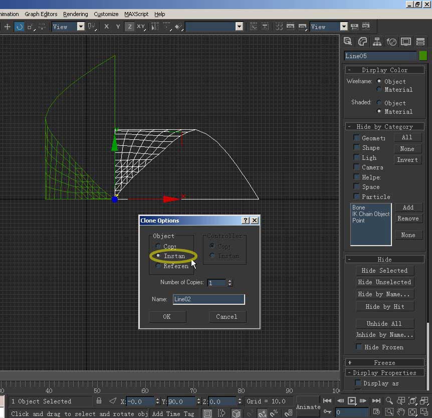 切换到编辑修改面板,进入line物体的线条子集,选 择线条物体,按住shift键向上移动,复制出另一条线段。