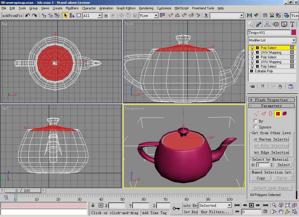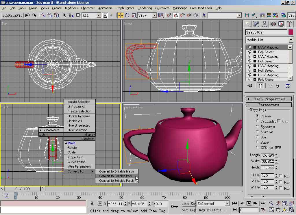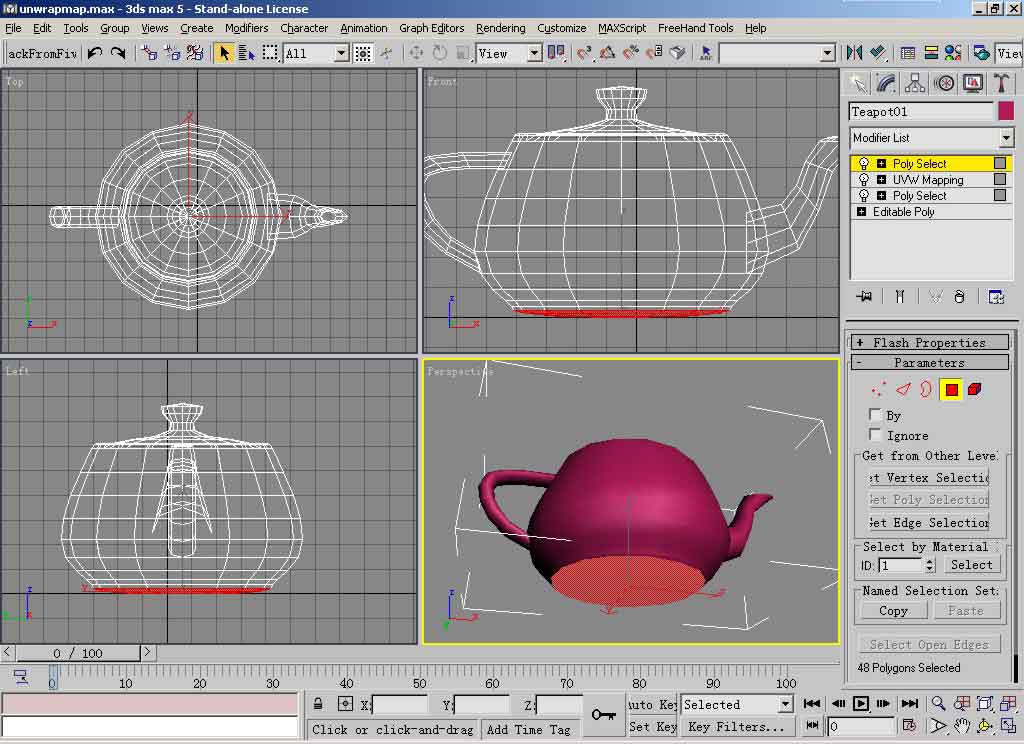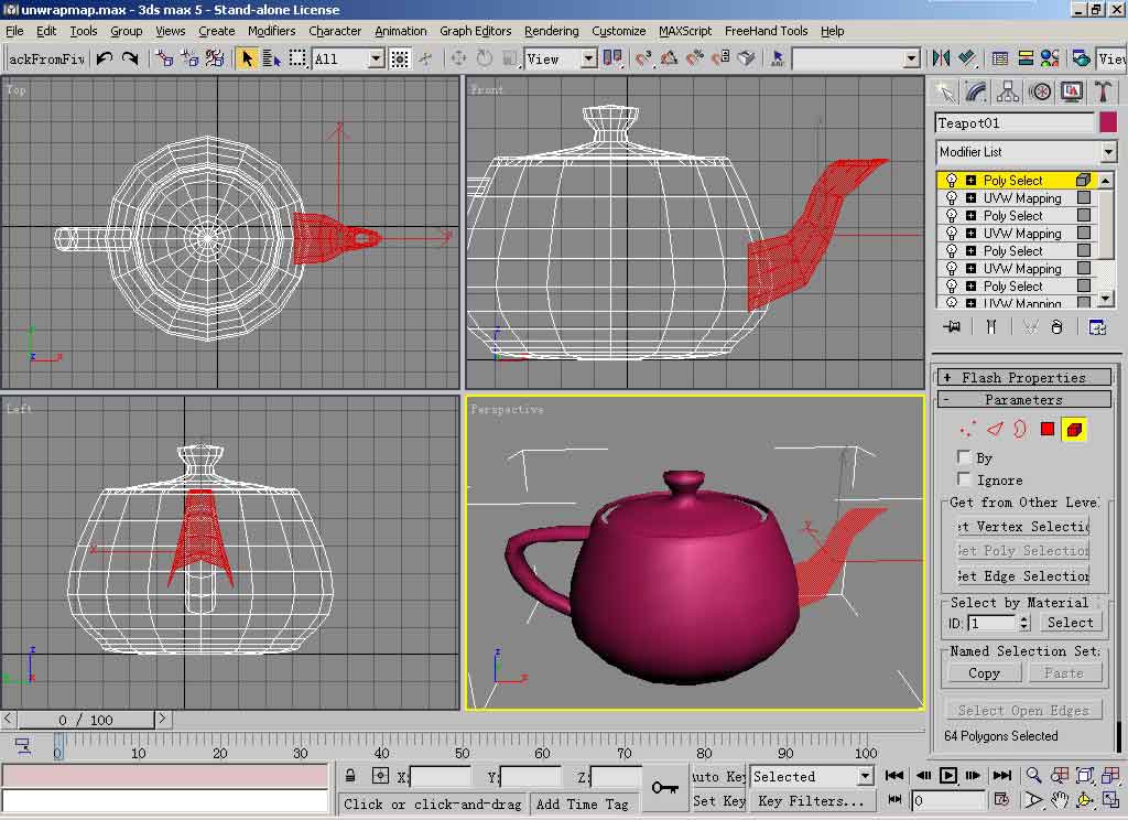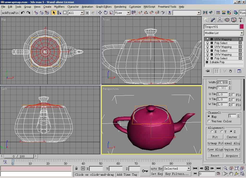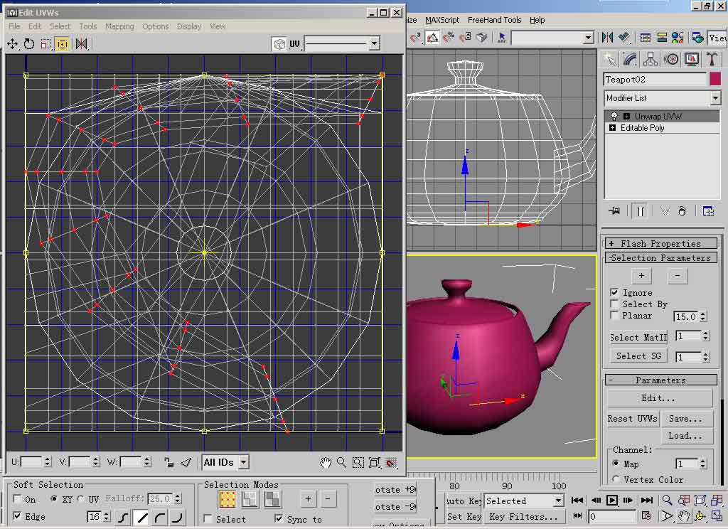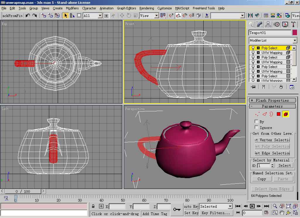 我们以一个茶壶为例,建立一个茶壶物体,并转换为editable poly网格物体。观察茶壶模型,你会发现它无法被准确地使用一个现成的贴图坐标来定义,于是我们将把它拆分,给不同局部赋予不同坐标。
