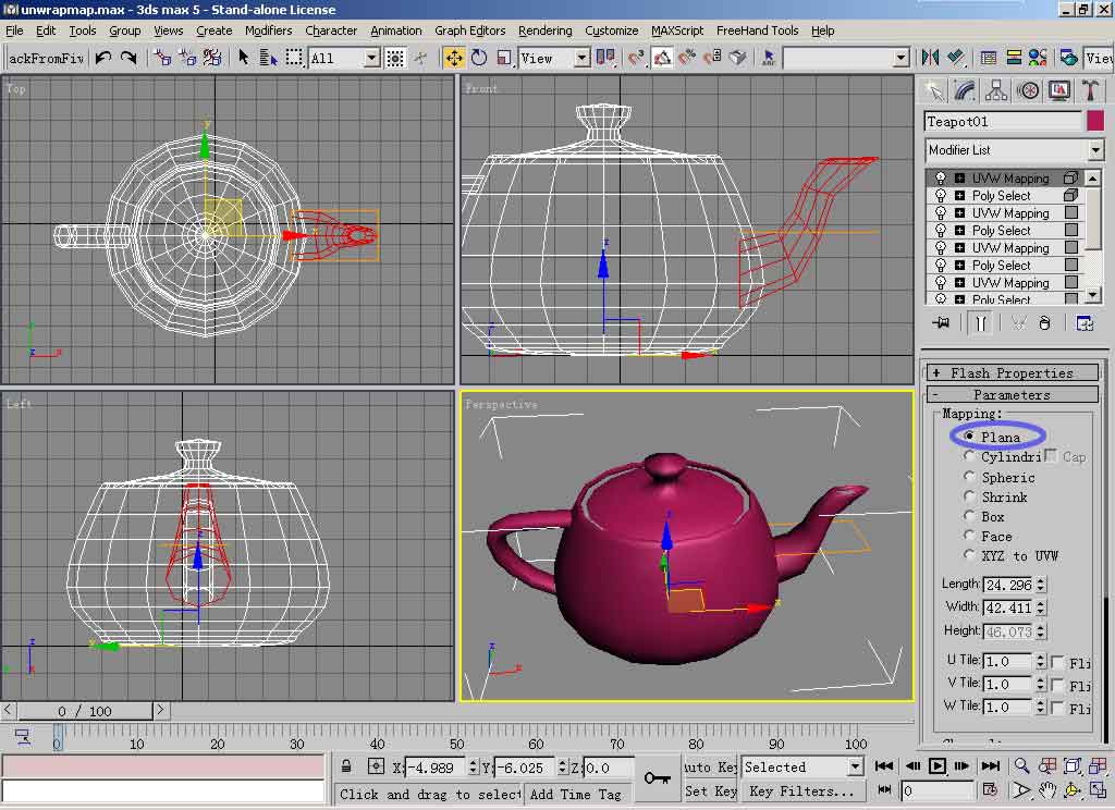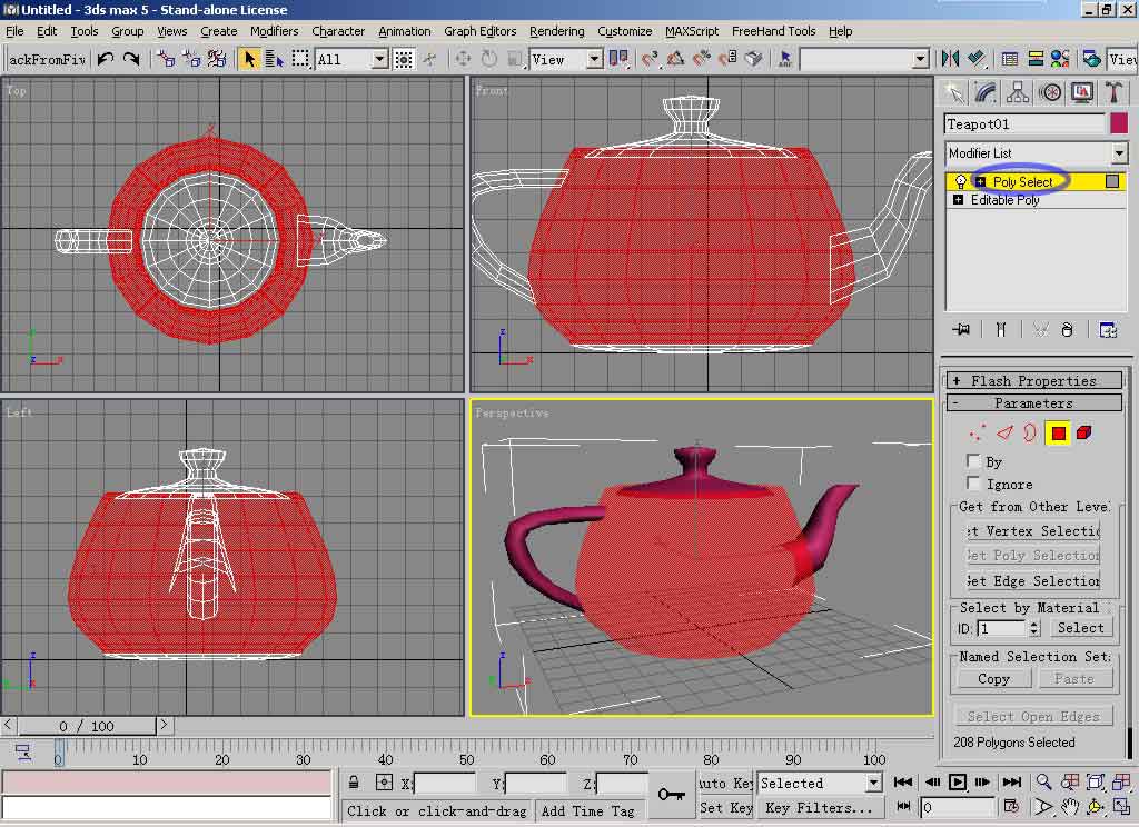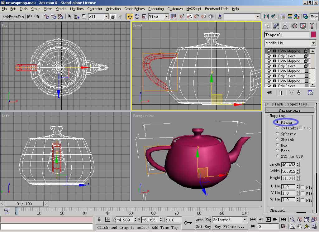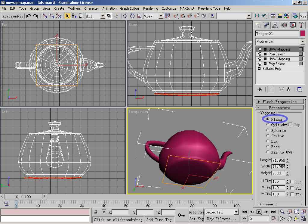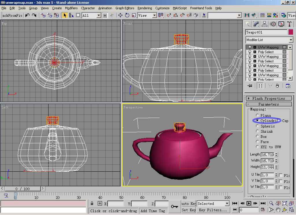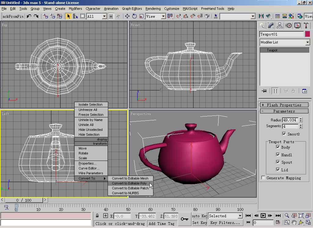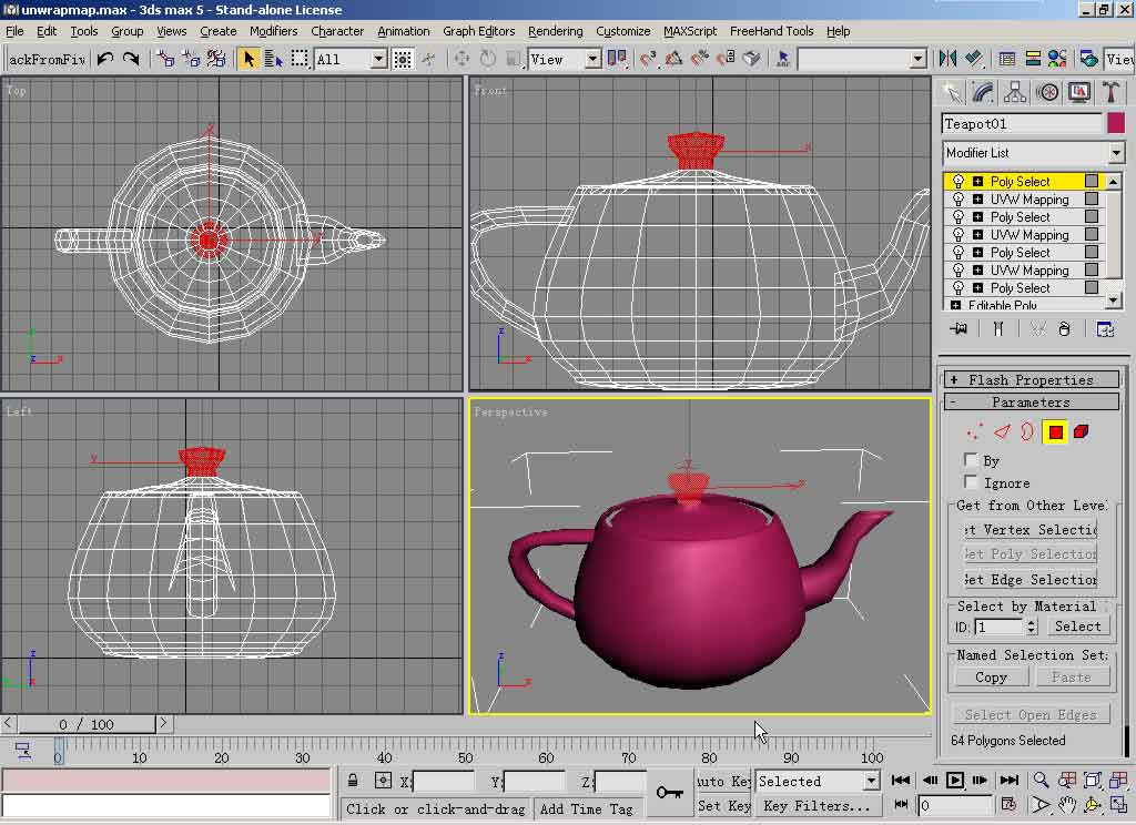 我们以一个茶壶为例,建立一个茶壶物体,并转换为editable poly网格物体。观察茶壶模型,你会发现它无法被准确地使用一个现成的贴图坐标来定义,于是我们将把它拆分,给不同局部赋予不同坐标。