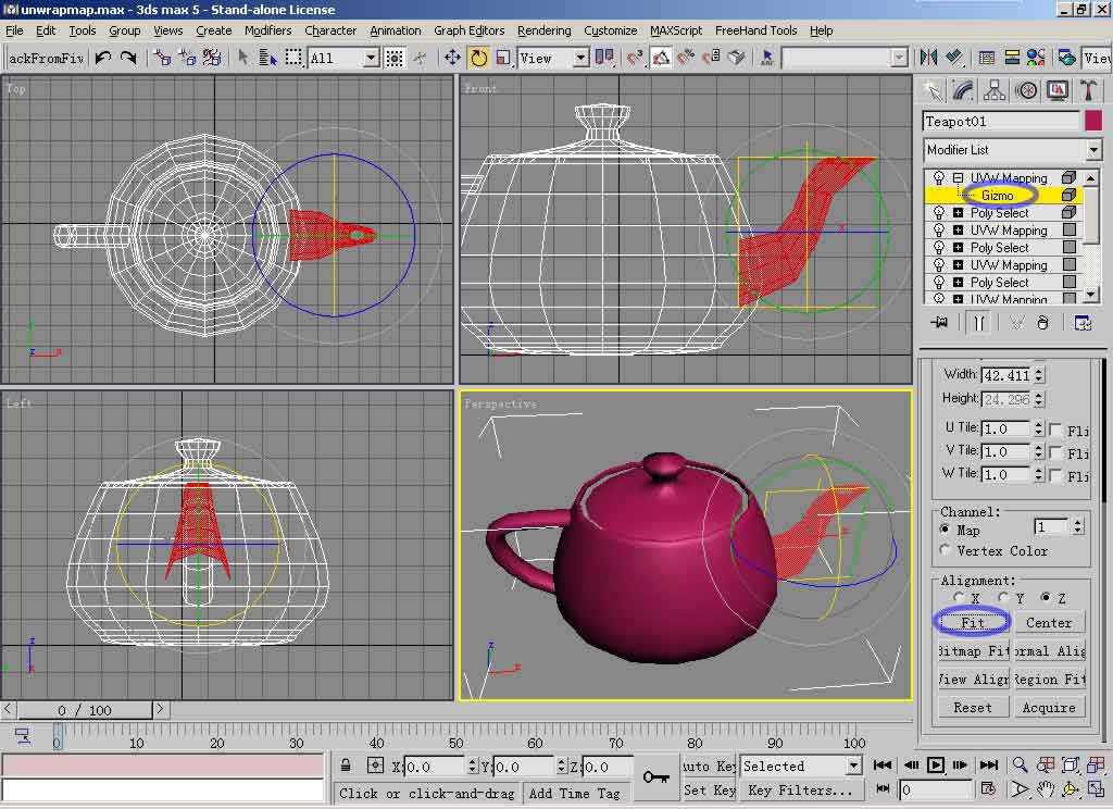 此时坐标的方向是不合适的,选择uvw map的gizmo,使用旋转工具把它旋转为如图状态,然后按下面板上的fit按钮,使坐标范围适合于茶壶嘴部分,退出gizmo。