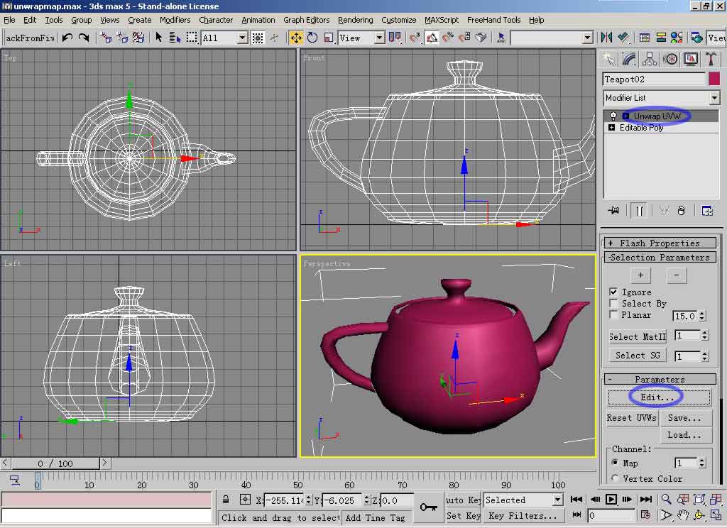 这样前边所有的坐标设定都被并入物体,该unwrap出场了。添加unwrap uvw修改器,按下其面板上的edit按钮。