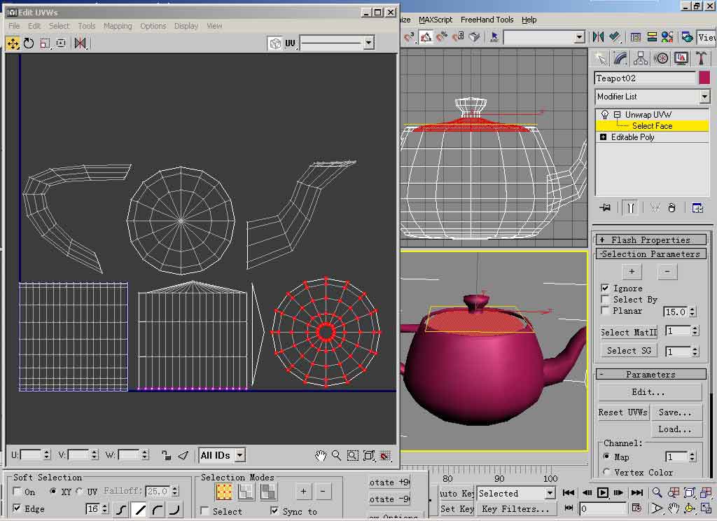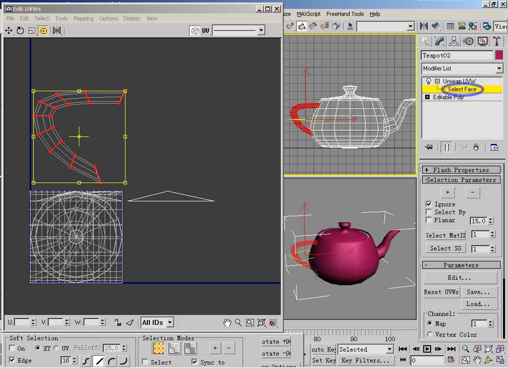 打开unwrap uvw的子集select face,这样在模型上选中的面将会同步显示在edit uvws视窗中,此时自动选中了最后一次被选中的部分,那就先把这个茶壶把手拿开,如图。